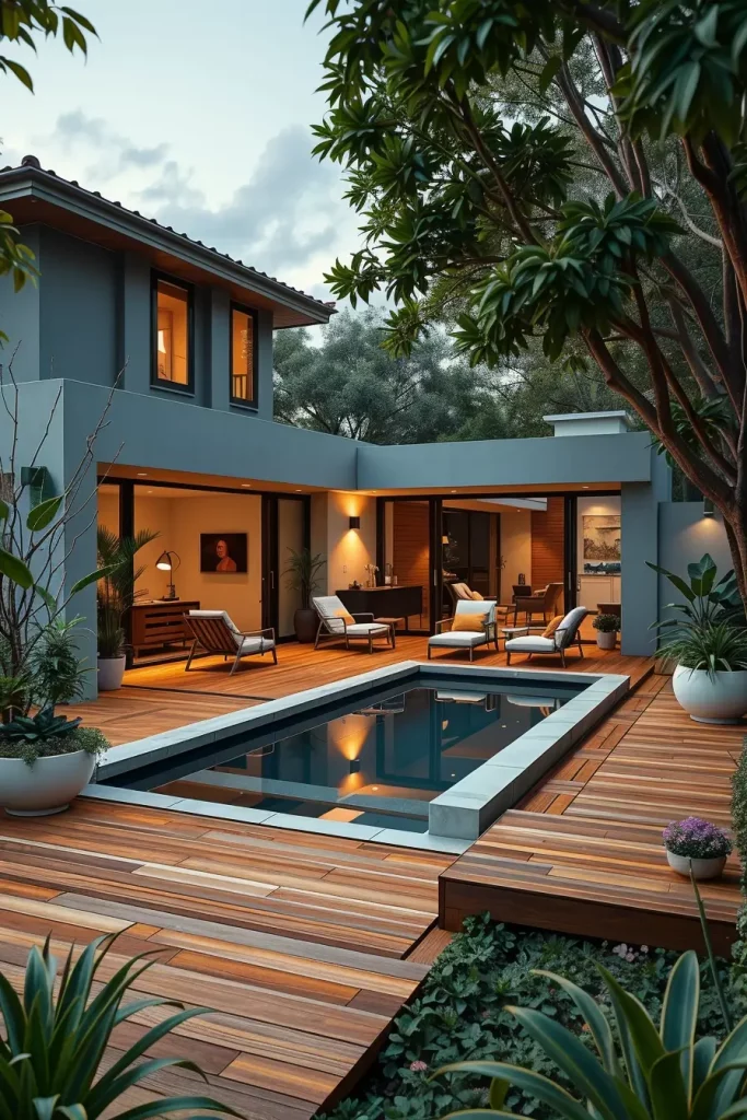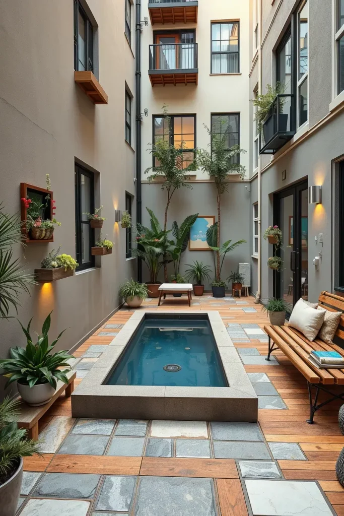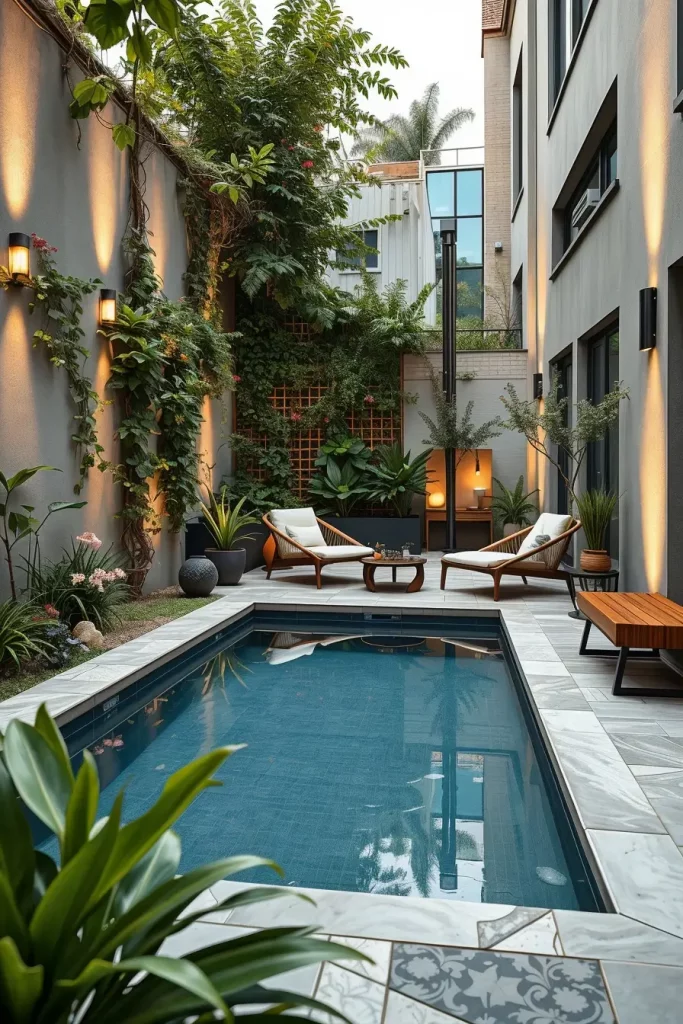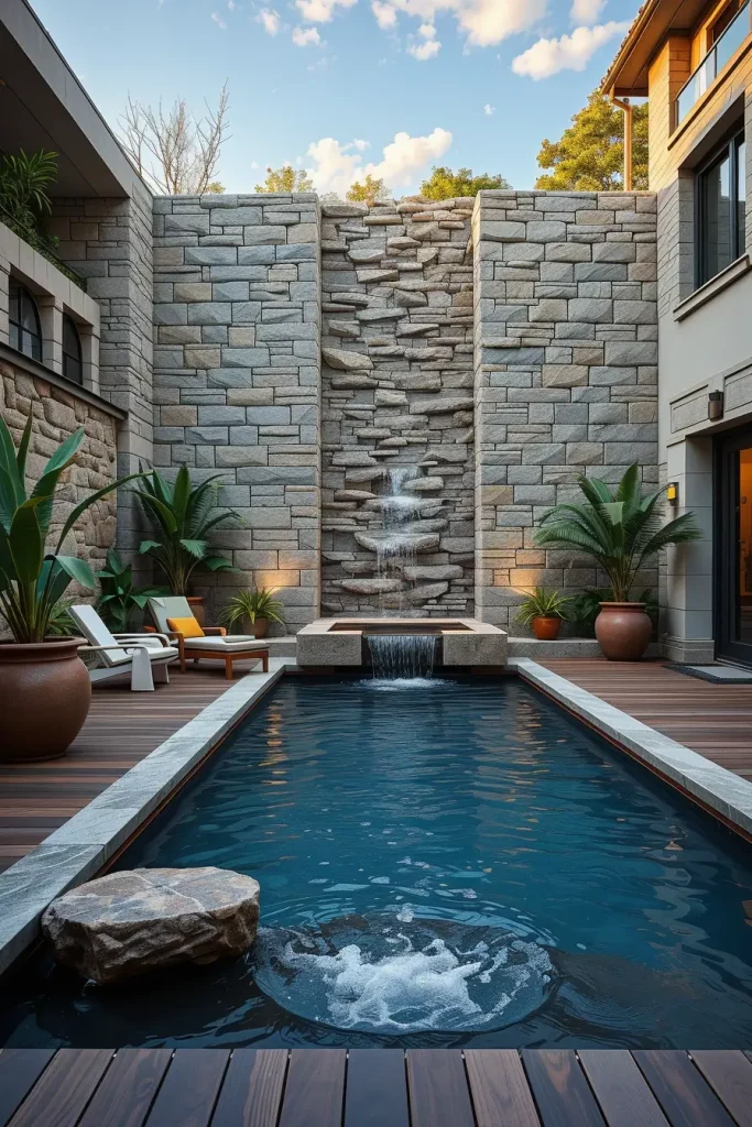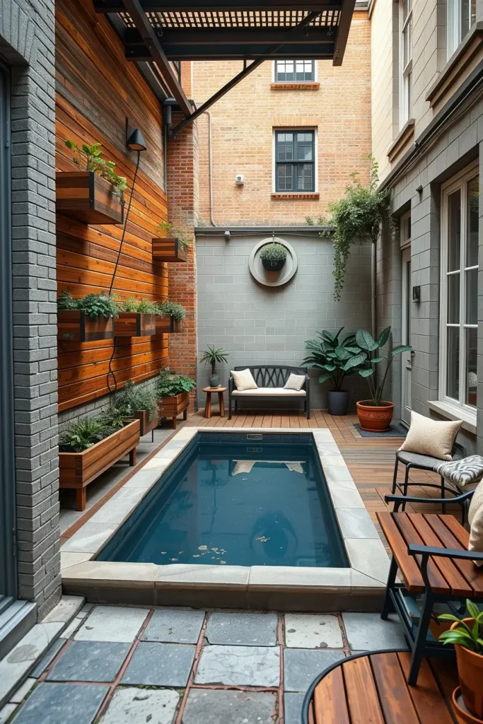 In my opinion, courtyard plunge pools feel especially intimate and relaxing. Many designers recommend layering textures such as wood decking, natural stone, and greenery to prevent the space from feeling too rigid. According to experts featured in Dwell magazine, combining vertical landscaping with water features helps smaller spaces feel more immersive and visually rich.