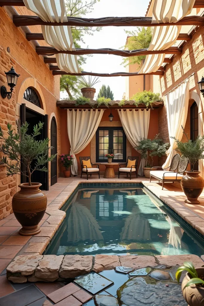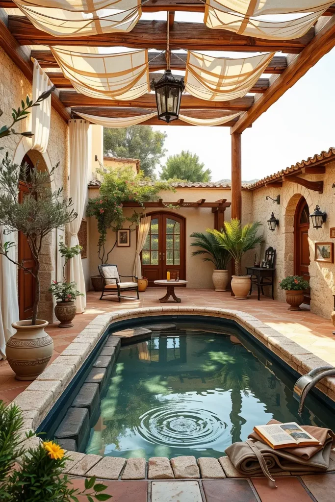 If I were refining the space further, I would recommend adding a small fountain or wall spout that gently pours water into the pool. This traditional Mediterranean detail enhances the visual charm while introducing a calming water sound that enriches the entire outdoor atmosphere.