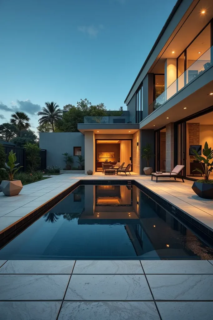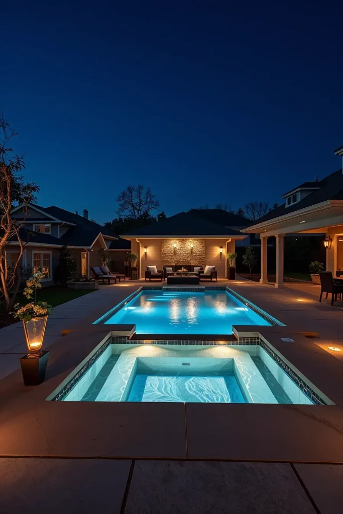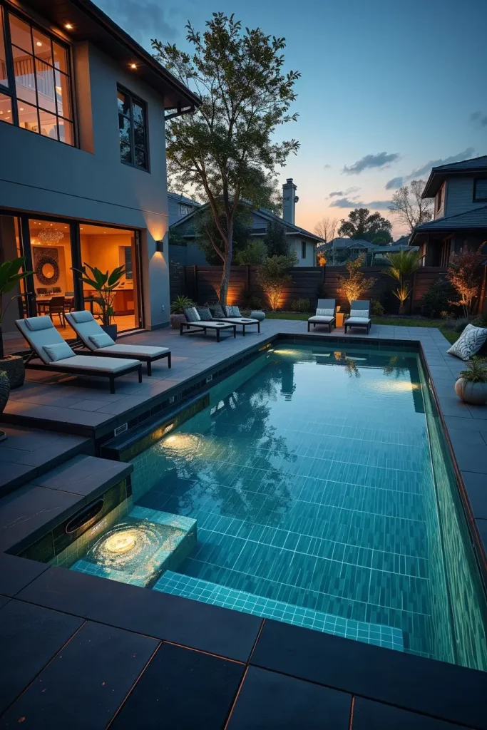 From my perspective, these lounge-style pools work best when combined with thoughtful lighting and subtle architectural details. Many designers recommend installing underwater LED lighting along the seating edges to highlight the water and create a calming glow at night. I have also seen great results when fire features or outdoor lanterns are added nearby, balancing the coolness of the water with warm visual elements.