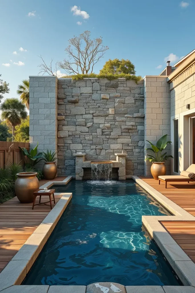 In these modern plunge pool designs, I prefer natural materials like stacked stone, slate walls, or textured concrete. A waterfall can flow from a raised wall or integrated stone feature, creating a layered architectural focal point. To complete the setting, I typically include wooden decking, sculptural planters, and comfortable lounge seating nearby.