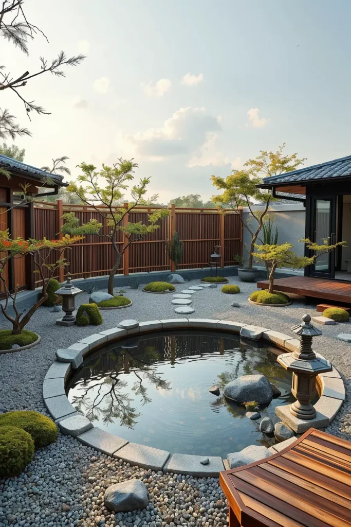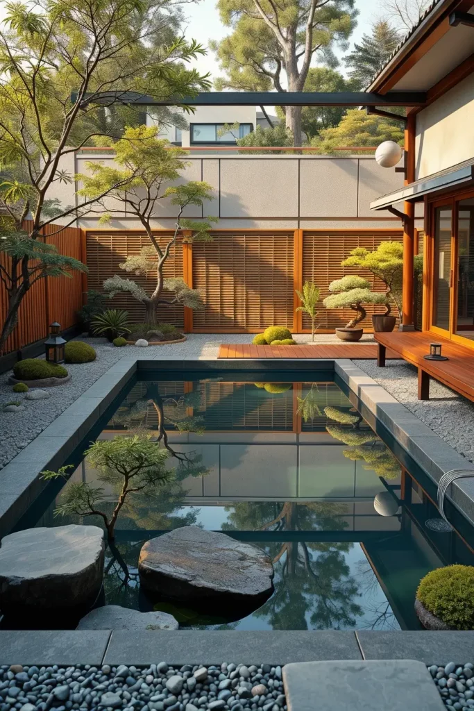 In these stylish plunge pools, every object has a purpose. I typically include bamboo fencing, low stone walls, and wooden decking made from natural cedar or teak. Around the pool, elements like bonsai trees, moss gardens, and stone lanterns help reinforce the peaceful character of the space.