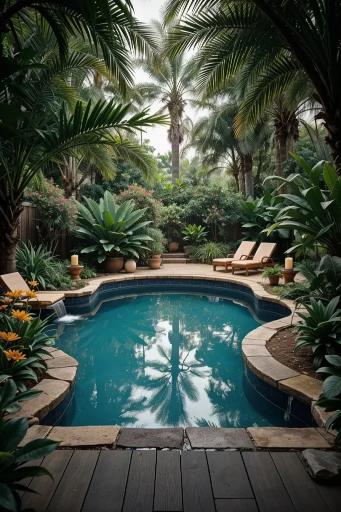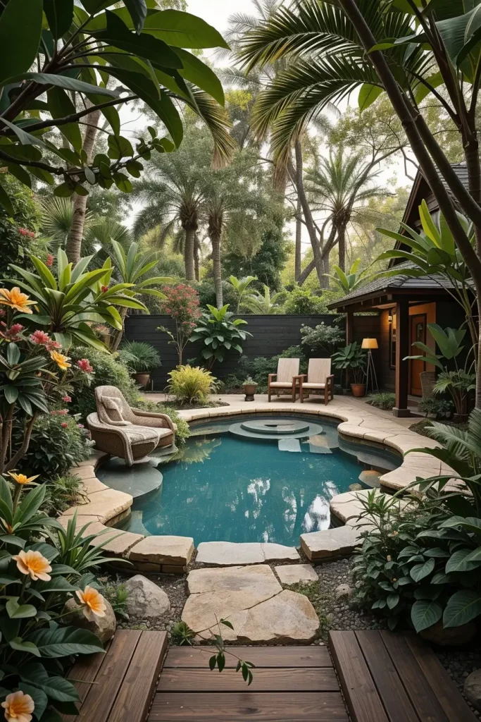 From my experience, the key to achieving an authentic tropical aesthetic is layering vegetation at different heights. Many landscape designers recommend combining tall canopy plants with mid-height shrubs and low ground covers. I often follow this approach because it creates depth and privacy while making the plunge pool feel like a hidden oasis.