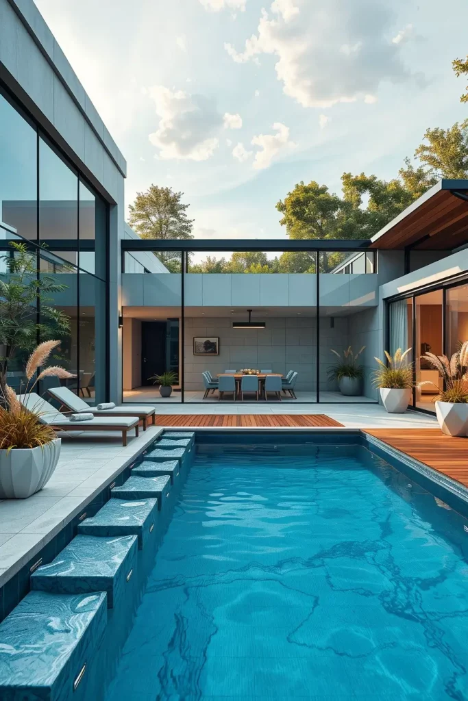 From my experience, the surrounding design elements are essential for making this concept work. I usually pair the glass pool structure with large-format porcelain tiles, sleek outdoor lounge chairs, and minimalist planters with ornamental grasses. A floating wooden deck or a narrow stone border often frames the pool, helping it look integrated rather than isolated. I also find that frameless glass panels enhance the modern aesthetic and maintain unobstructed views across the space.