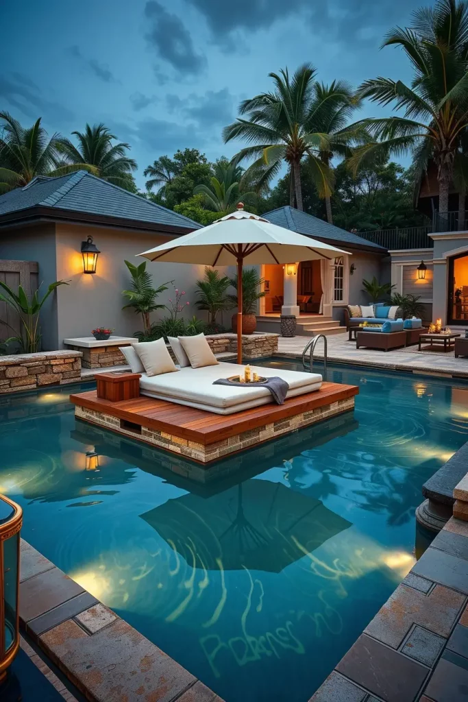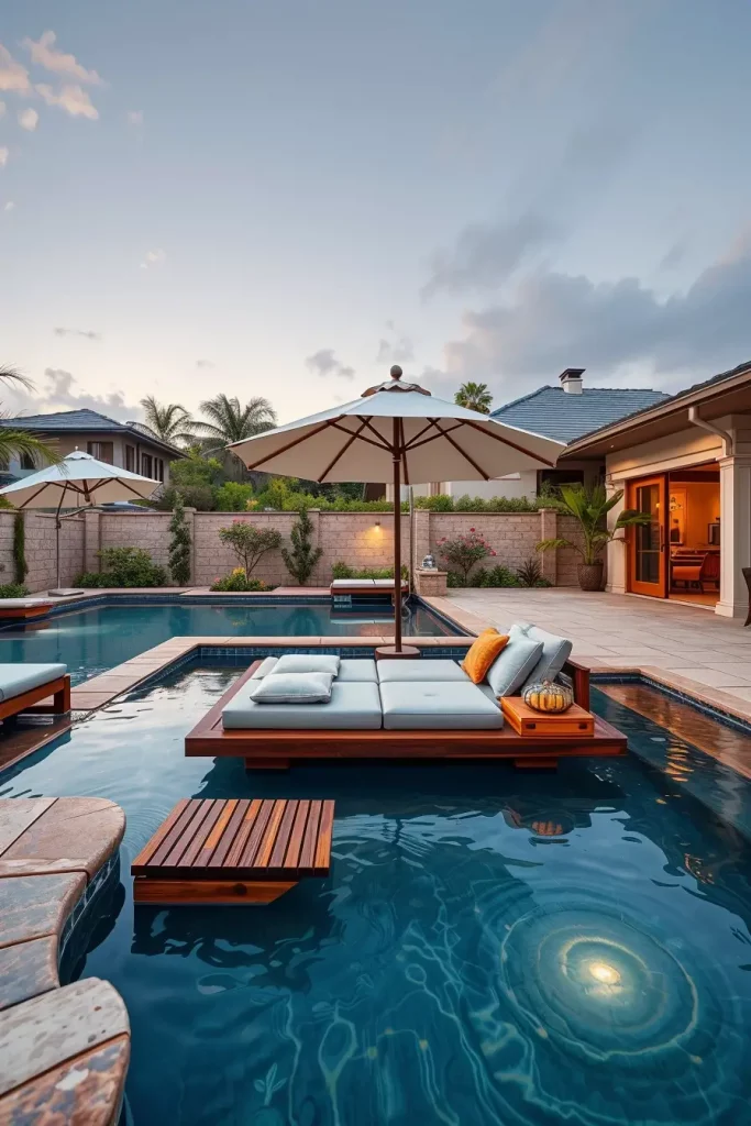 When designing these spaces, I typically integrate wide submerged platforms with cushioned outdoor daybeds, teak loungers, or built-in stone seating. Soft outdoor textiles, neutral-toned umbrellas, and side tables for drinks help transform the area into a complete relaxation zone. Natural materials such as wood decking and limestone tiles enhance the tranquil atmosphere.