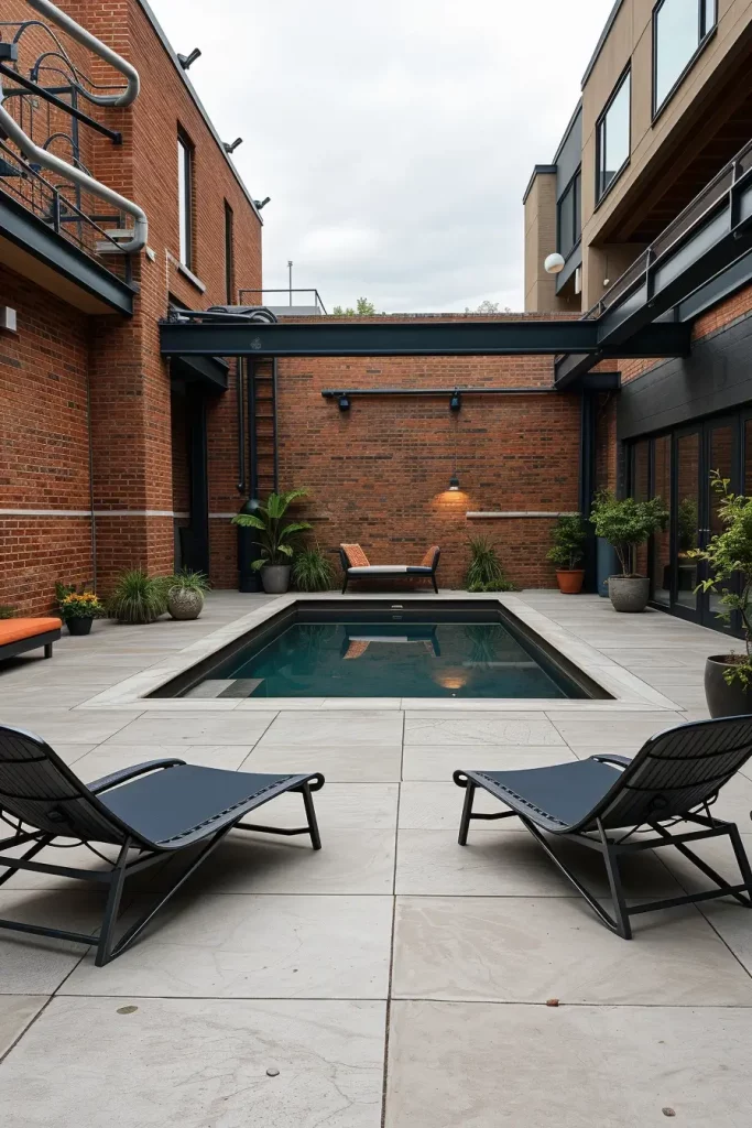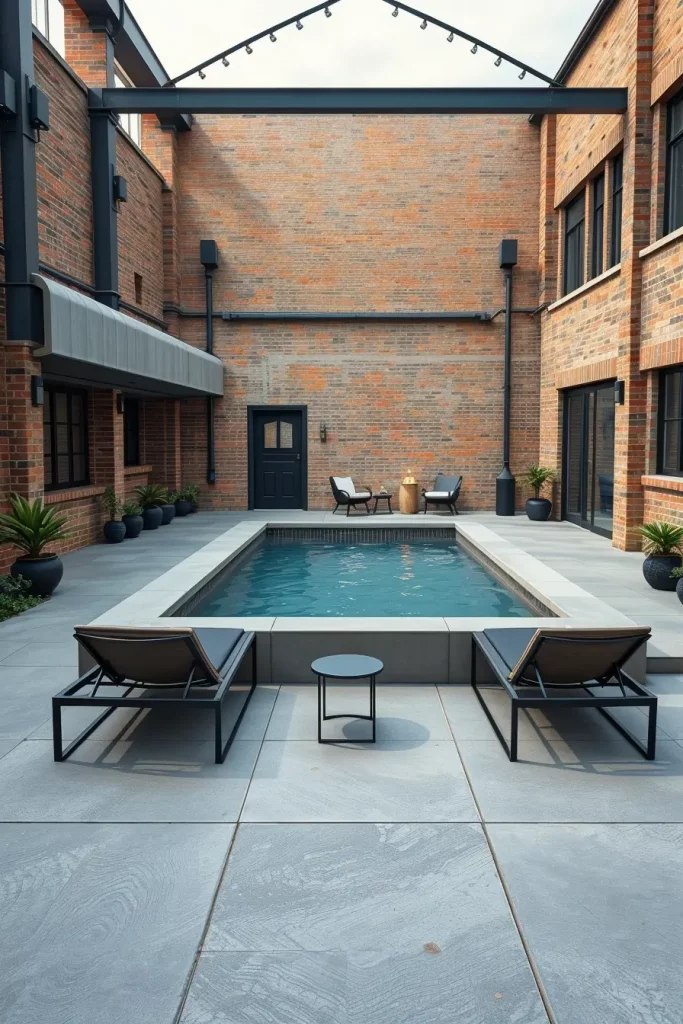 To enhance the industrial atmosphere, I sometimes incorporate LED strip lighting along the pool edges or install subtle water spillways that add movement to the otherwise minimalist environment.