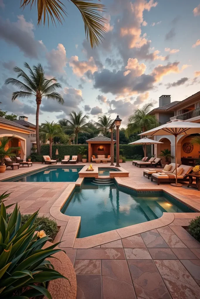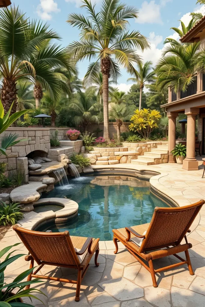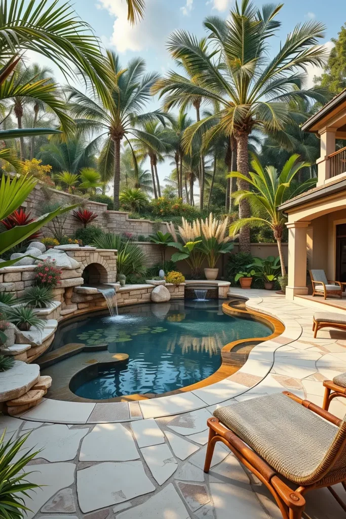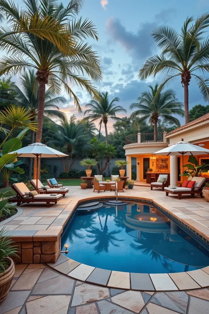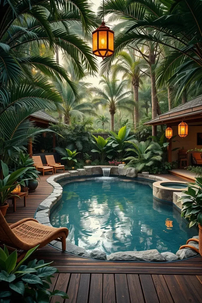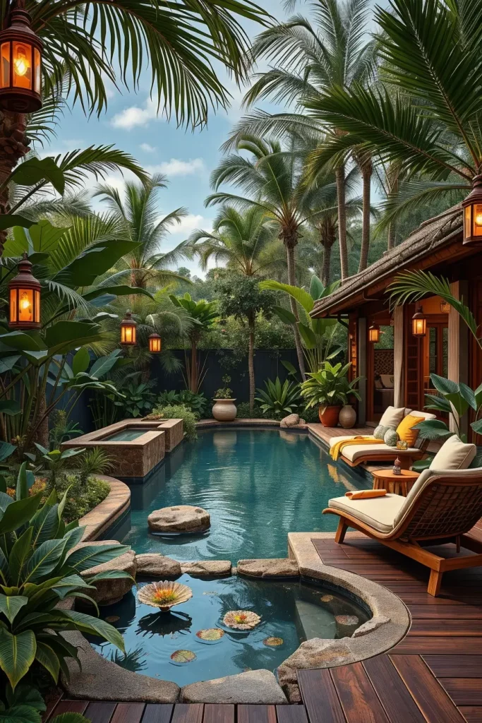 The pool itself often features natural materials such as textured stone tiles or pebble finishes that resemble lagoon-style water features. Around the pool, I typically include dense planting layers with palms, banana plants, ferns, and flowering shrubs. Wooden decking, rattan outdoor furniture, and woven lounge chairs enhance the tropical atmosphere while maintaining comfort and durability.