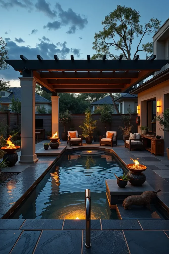 From my perspective, unique plunge pools like this become natural focal points for evening gatherings. Media outlets like HGTV often emphasize that outdoor fire features extend the usability of outdoor spaces long after sunset. I regularly incorporate warm lighting, textured surfaces, and layered seating to reinforce this inviting atmosphere.