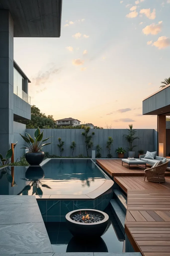 Combining water and fire is one of the most visually dramatic plunge pool ideas 2026. A plunge pool with a fire pit creates a powerful contrast between warm flames and cool water, resulting in a striking outdoor environment. I often use this design approach for contemporary patios and luxury backyard entertainment spaces.