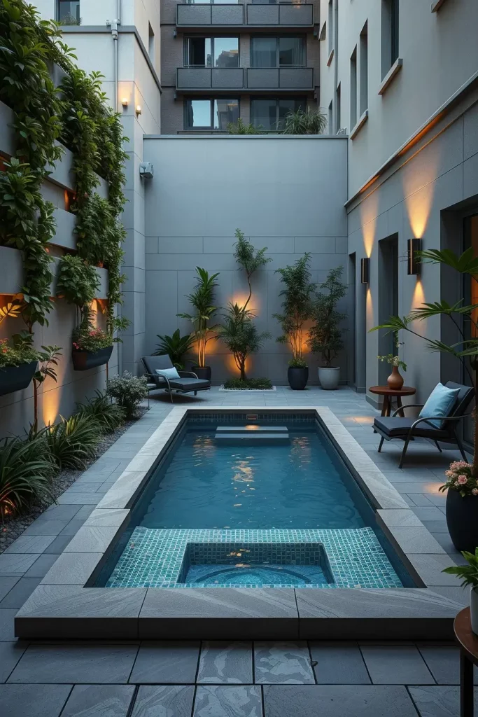 From my professional experience, vertical landscaping is one of the most effective strategies for urban plunge pool areas. Designers often emphasize the importance of green walls, climbing plants, or tall narrow planters to add greenery without sacrificing valuable floor space. I personally like incorporating soft lighting along walls and steps because it makes the entire outdoor space feel larger and more inviting during the evening.