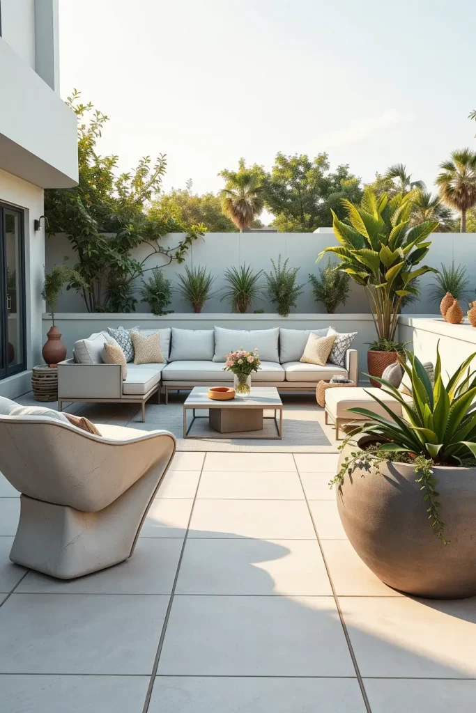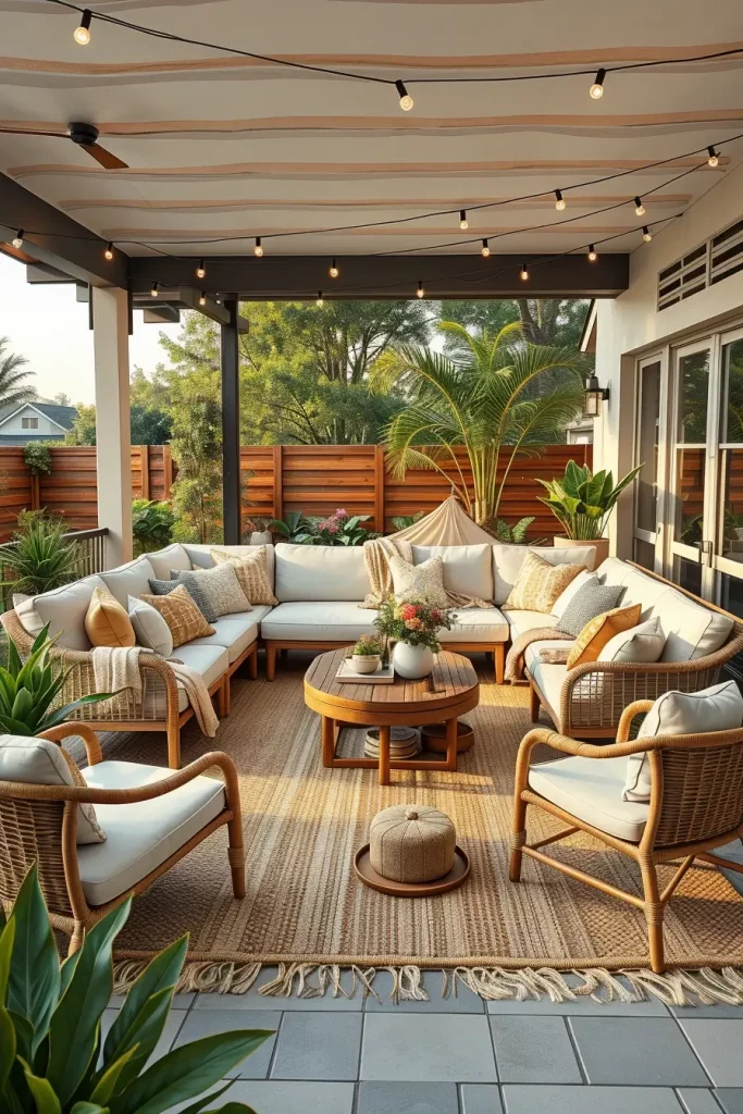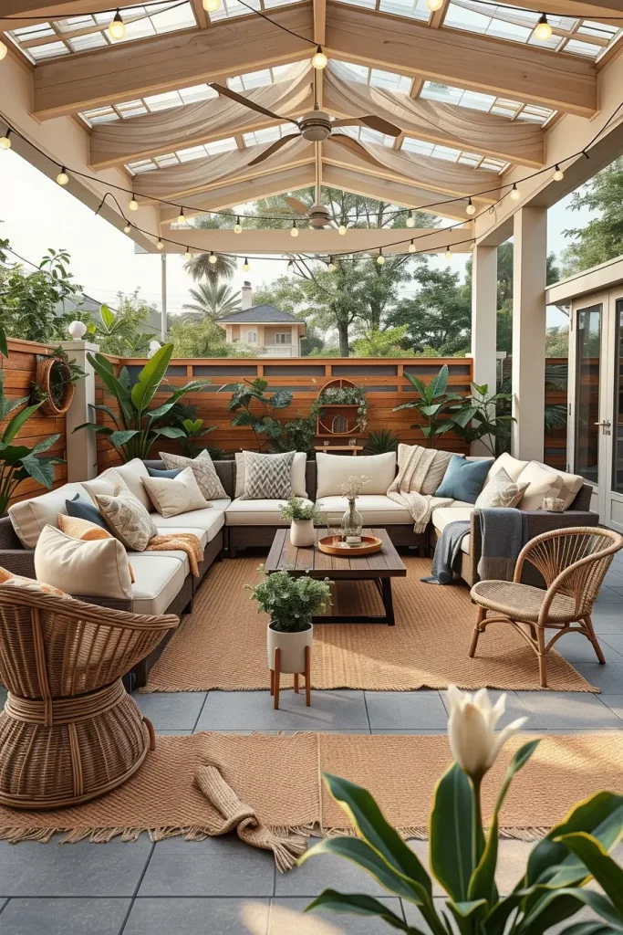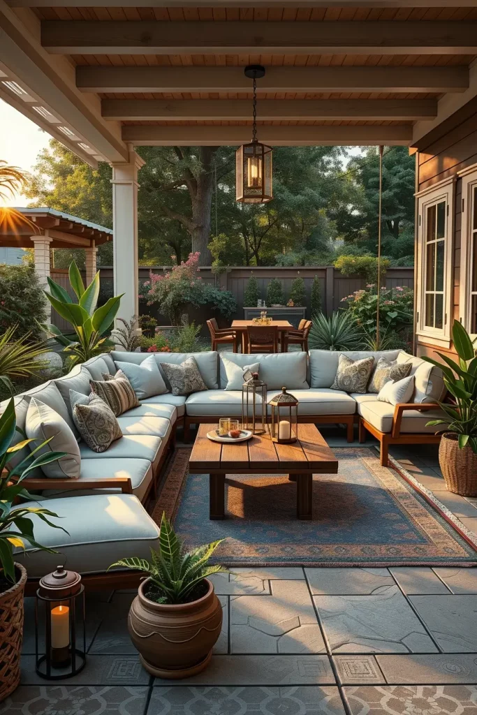 I usually focus on layered cushions, weather-resistant throws, and soft neutral fabrics to build visual depth. Outdoor sectional sofas with thick seat cushions work perfectly for this concept. I also add decorative pillows in various sizes to enhance comfort and style. A low wooden or rattan coffee table, outdoor side tables, and a woven outdoor rug help anchor the seating area and define the space within the patio.
