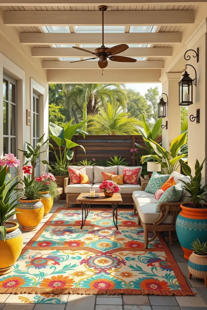 Sometimes the easiest way to refresh a patio is by introducing bold color through summer patio decor ideas 2026. I often use vibrant outdoor rugs as the foundation for colorful patio designs because they instantly energize the space and define seating zones.