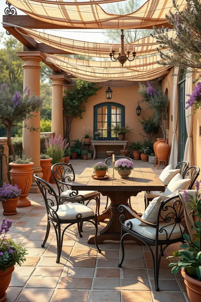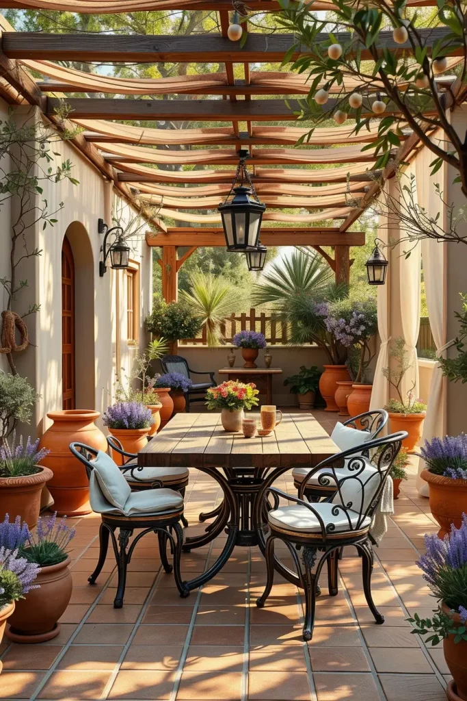 From my experience, adding a pergola with light fabric curtains can completely transform the patio and create soft shade during hot summer afternoons. Many designers featured in magazines like Architectural Digest recommend mixing traditional terracotta elements with modern outdoor furniture to prevent the space from feeling outdated while keeping the warm Mediterranean charm.