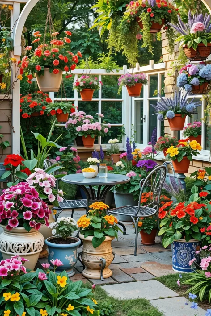 In my experience, mixing flowering plants with greenery like ferns, ivy, or ornamental grasses creates a more natural and balanced composition. Garden designers often recommend grouping plants in clusters rather than spreading them evenly across the patio, which makes the arrangement feel more organic and intentional.