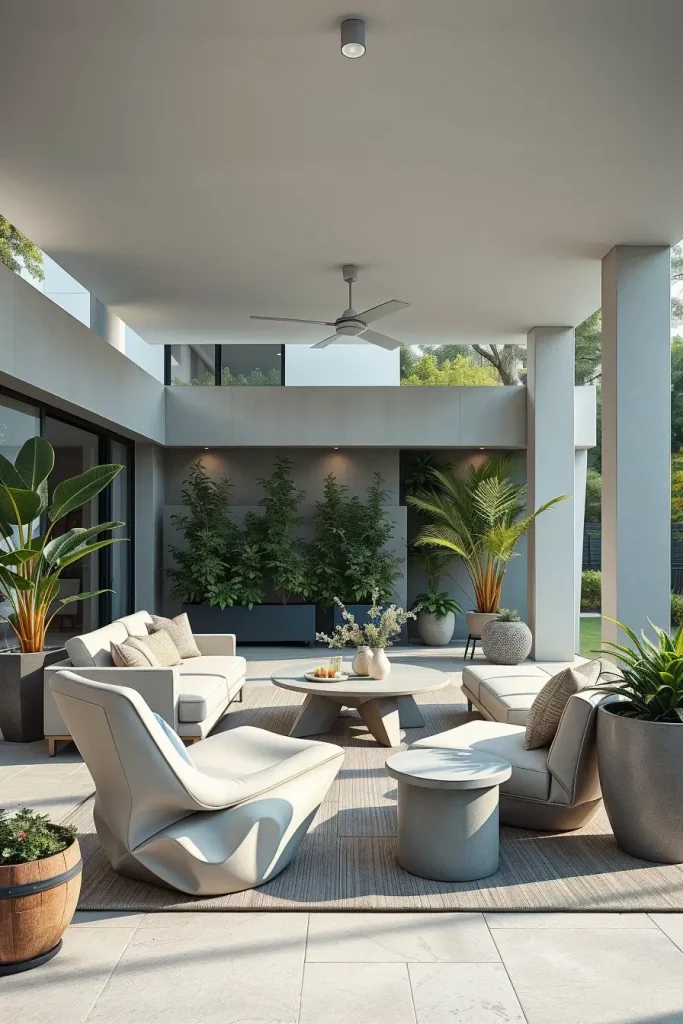 When I design minimalist patios, I usually start with high-quality outdoor furniture that becomes the focal point of the space. A sculptural lounge chair, a sleek sectional sofa, or a modern concrete coffee table can instantly define the style of the patio. Neutral colors such as white, charcoal, beige, and natural wood tones help create a calm and sophisticated atmosphere.