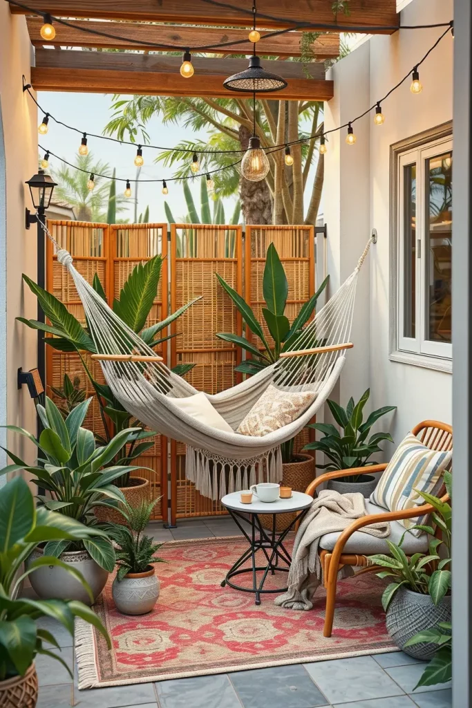 In my opinion, the surroundings of the hammock are just as important as the hammock itself. Tall potted plants, bamboo screens, or climbing vines can create a sense of privacy while also adding natural beauty to the patio. Designers often suggest combining hammocks with shaded pergolas or umbrellas to make the space comfortable during hot afternoons.