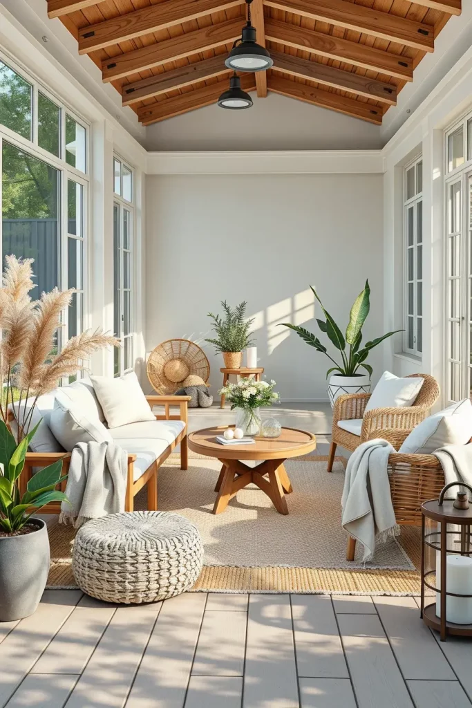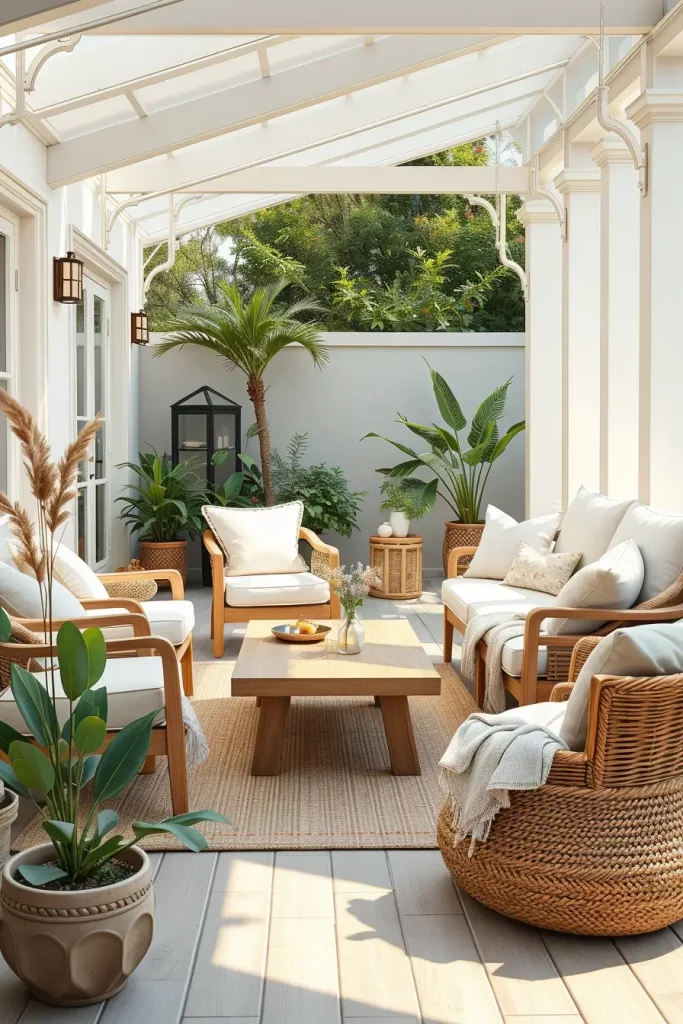 In this design, I usually include light wood furniture, simple outdoor sofas with neutral cushions, and clean-lined coffee tables. Pale tones like white, soft gray, and beige dominate the palette because they create a fresh and airy atmosphere. To add warmth, I like to incorporate woven baskets, linen throws, and textured outdoor rugs that soften the minimal aesthetic without overwhelming the space.