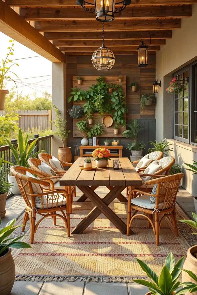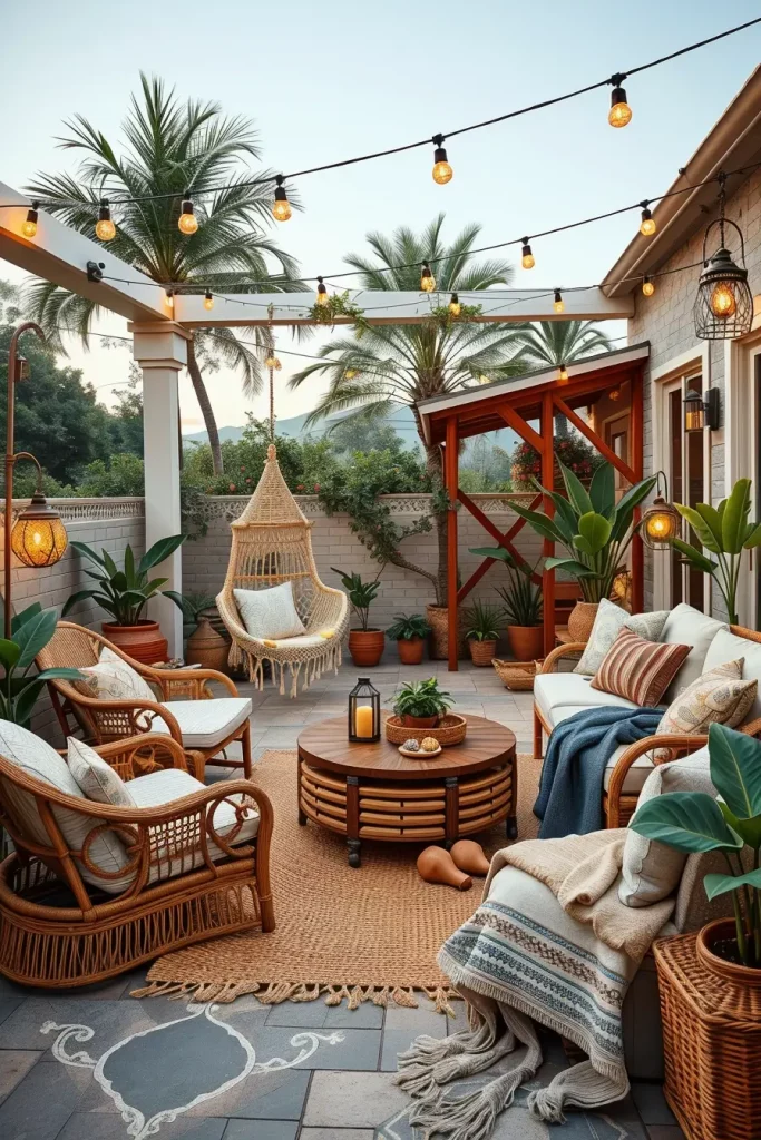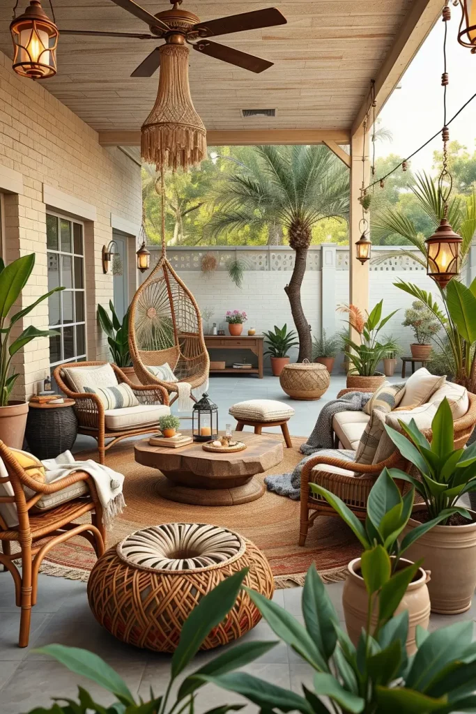 I like to include rattan lounge chairs, macrame hanging chairs, and wooden coffee tables as the main furniture pieces. Layered outdoor rugs, textured pillows, and soft neutral throws enhance the boho aesthetic. Decorative elements such as woven baskets, ceramic planters, and pampas grass arrangements help add visual interest without making the space feel cluttered.