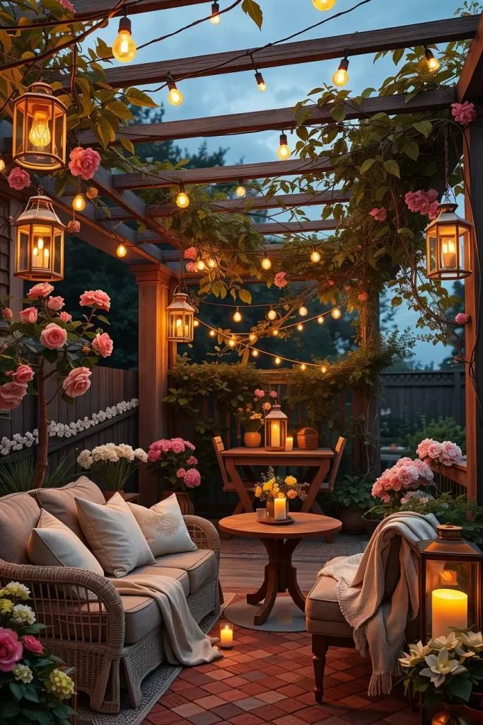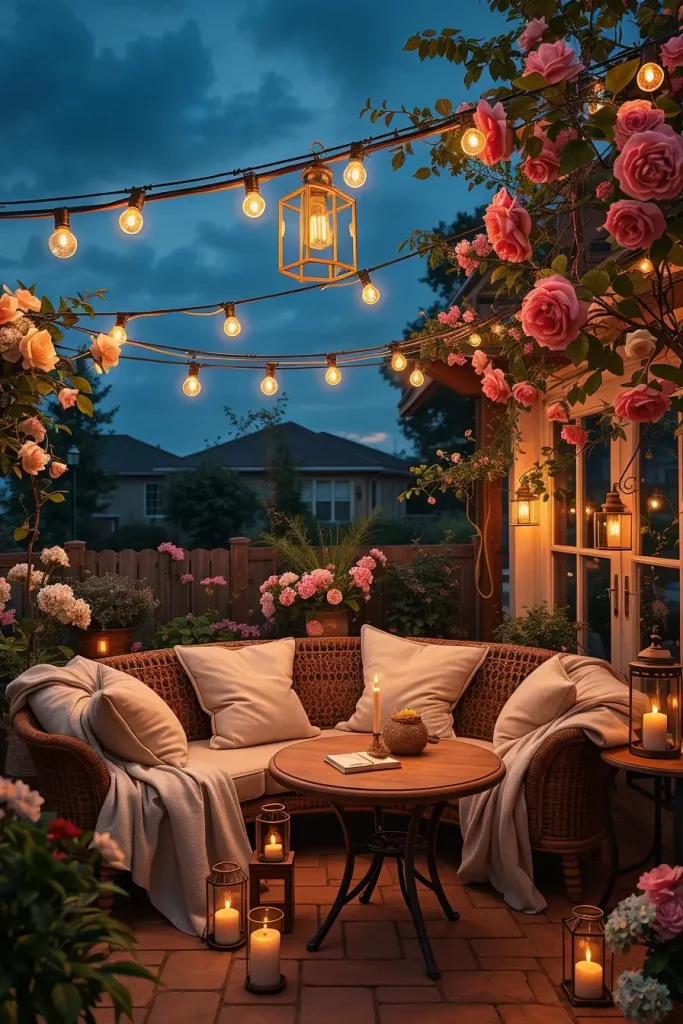 When I create romantic outdoor spaces, I usually start with warm lighting. String lights draped above the patio instantly create a magical environment, especially when combined with lanterns, candles, and soft wall lights. This layered lighting design produces a gentle glow that transforms the entire patio after sunset.