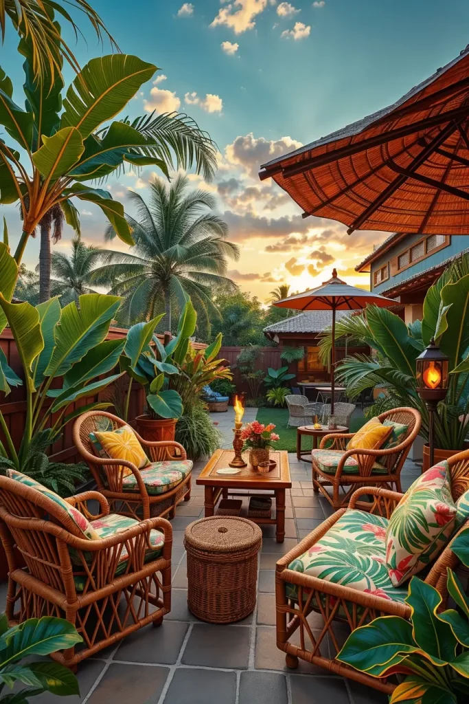In tropical patio designs, I usually incorporate bamboo furniture, rattan chairs, and wooden tables that reflect natural island materials. Bright cushions with tropical patterns, palm leaf prints, and vibrant colors help create an energetic and relaxed environment.