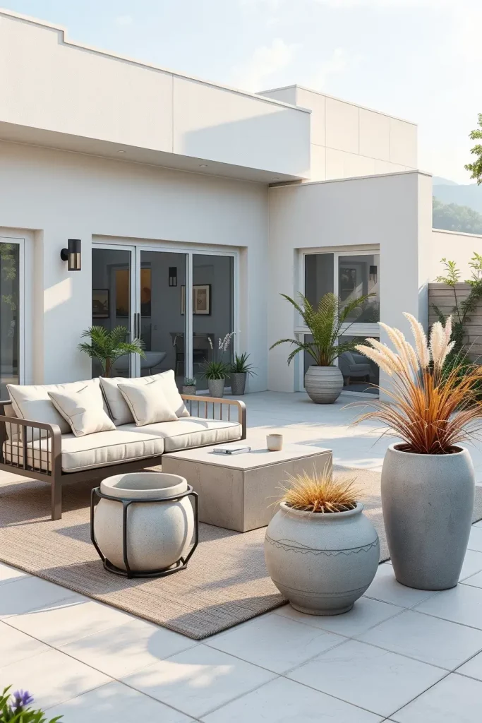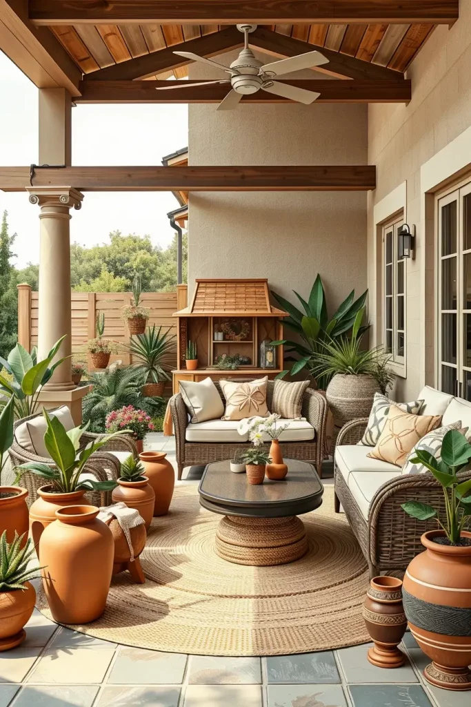 To complete this type of patio design, I like to introduce natural textures such as jute rugs, clay pottery, and wooden lanterns. These elements help maintain a balanced and harmonious patio decor composition.