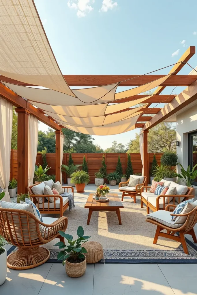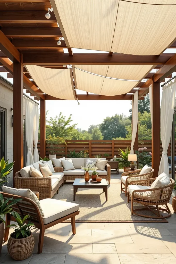 I usually recommend combining shade with carefully selected furniture to create a cohesive outdoor decor concept. A wooden pergola with climbing plants, for example, pairs beautifully with rattan lounge chairs, a weather-resistant sectional sofa, and a low teak coffee table. Outdoor curtains can soften the structure while providing extra sun protection. Adding woven lanterns, ceramic planters, and a neutral outdoor rug helps bring warmth and personality to the entire patio design.