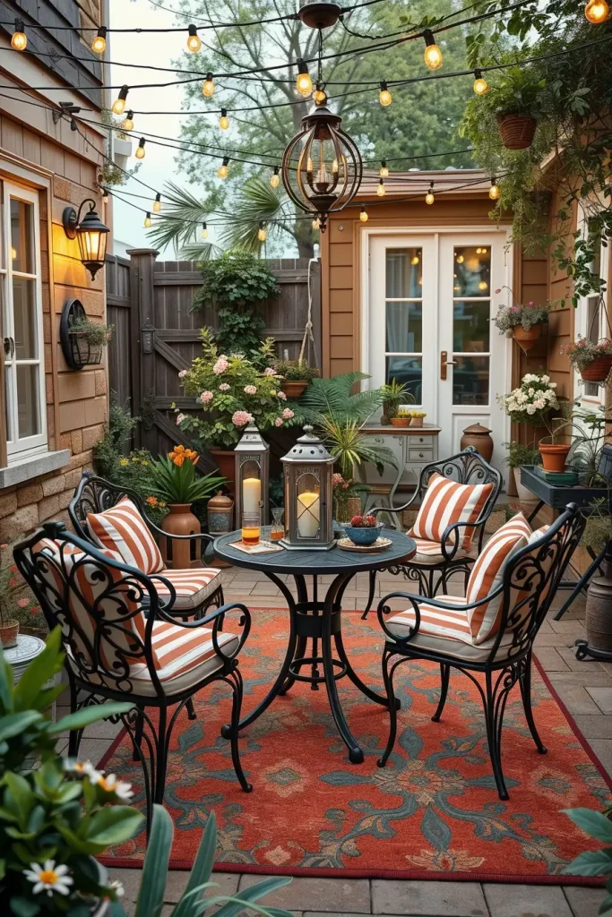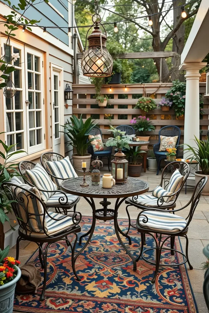 In my projects, I usually combine wrought-iron furniture with soft cushions in faded floral or striped patterns. A round metal café table paired with curved chairs immediately sets the tone for a vintage patio. Accessories such as antique lanterns, enamel watering cans used as planters, and patterned outdoor rugs add depth and personality to the outdoor decor ideas.