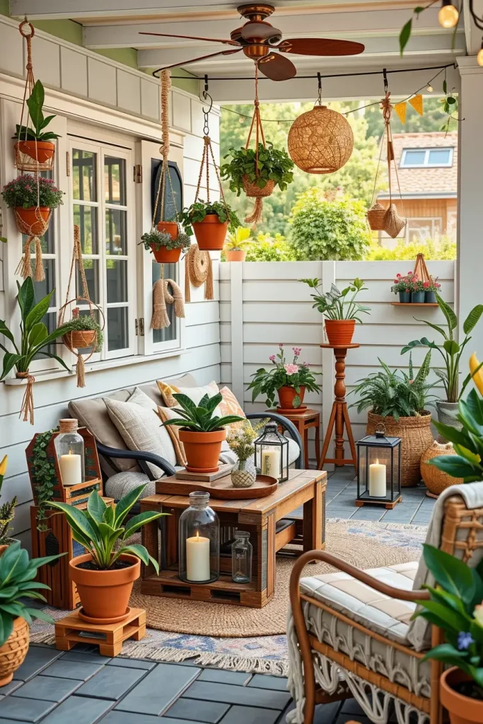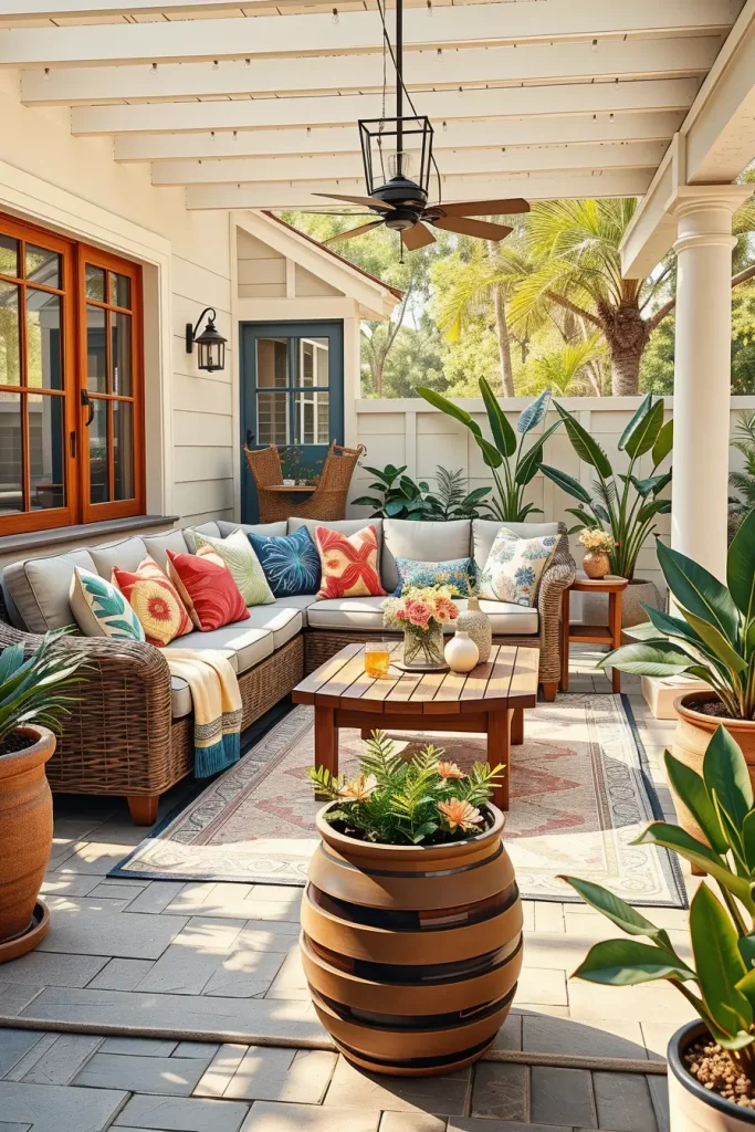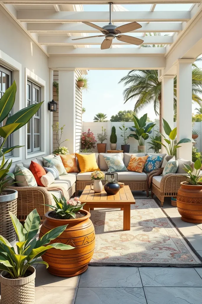 From my experience, successful boho patio decor ideas for summer always include plants. I usually add large tropical plants, trailing greenery, or potted palms to create a natural oasis effect. Outdoor designers frequently mention that greenery is essential for softening outdoor spaces and bringing life to the patio environment.