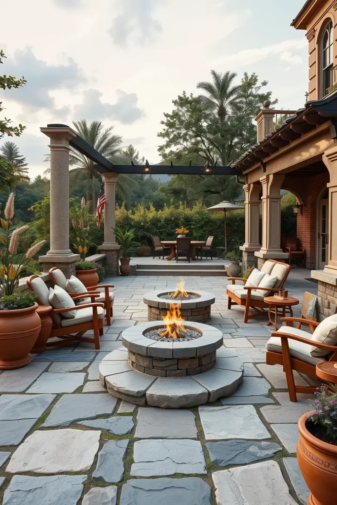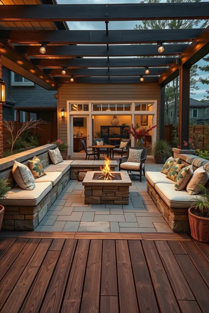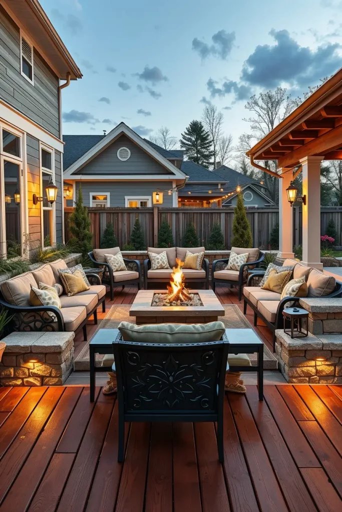 When planning this type of patio, I usually place the fire pit at the center of the seating arrangement. Surrounding it with comfortable outdoor chairs, deep cushioned sofas, or Adirondack chairs creates a welcoming layout that encourages conversation. Materials like natural stone, concrete, or steel work beautifully for fire pits because they feel modern while also being durable.