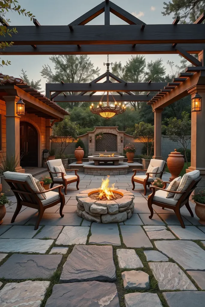 In many designs, I combine stone flooring or stone accent walls with natural wood furniture. A large stone fire pit surrounded by comfortable lounge chairs creates a welcoming focal point for the patio. I also like incorporating natural materials such as terracotta planters, gravel pathways, and wooden pergolas to reinforce the organic look of the outdoor decor ideas.