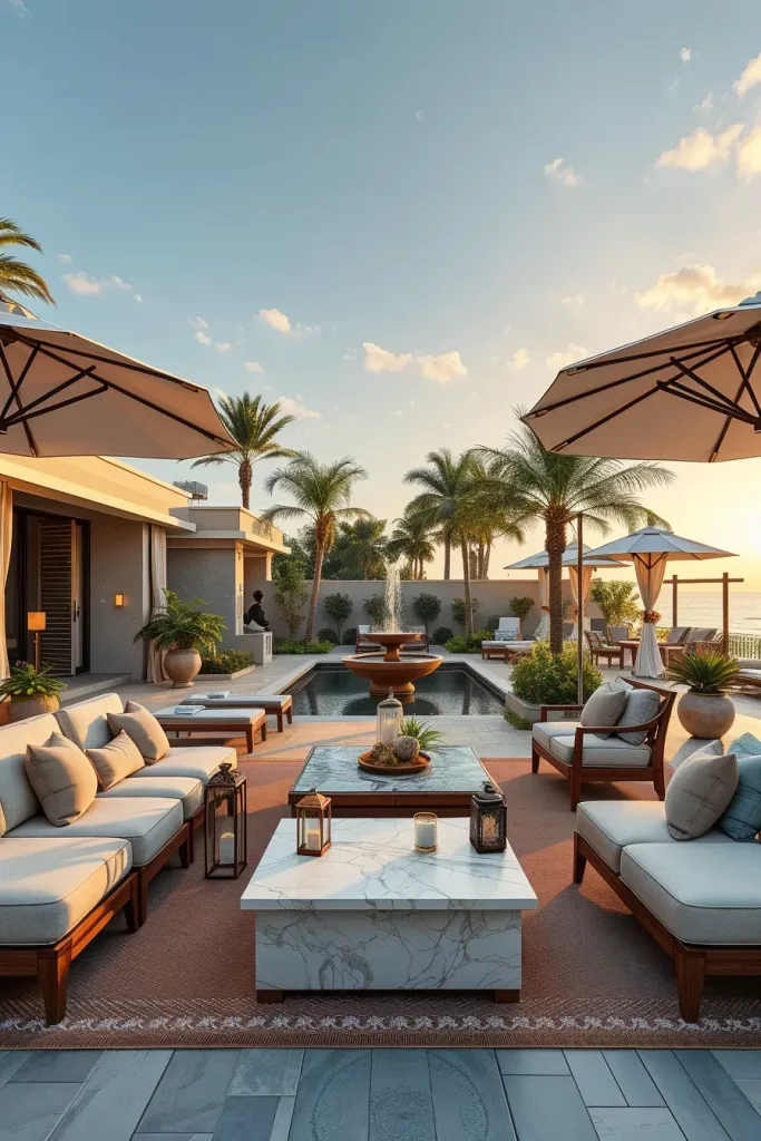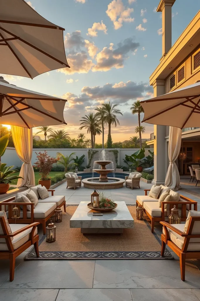 To enhance this section further, I usually recommend including subtle water features such as a modern fountain or reflecting pool. These elements add gentle sound and movement, making the luxury patio decor feel even more tranquil and immersive.