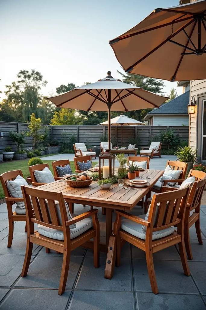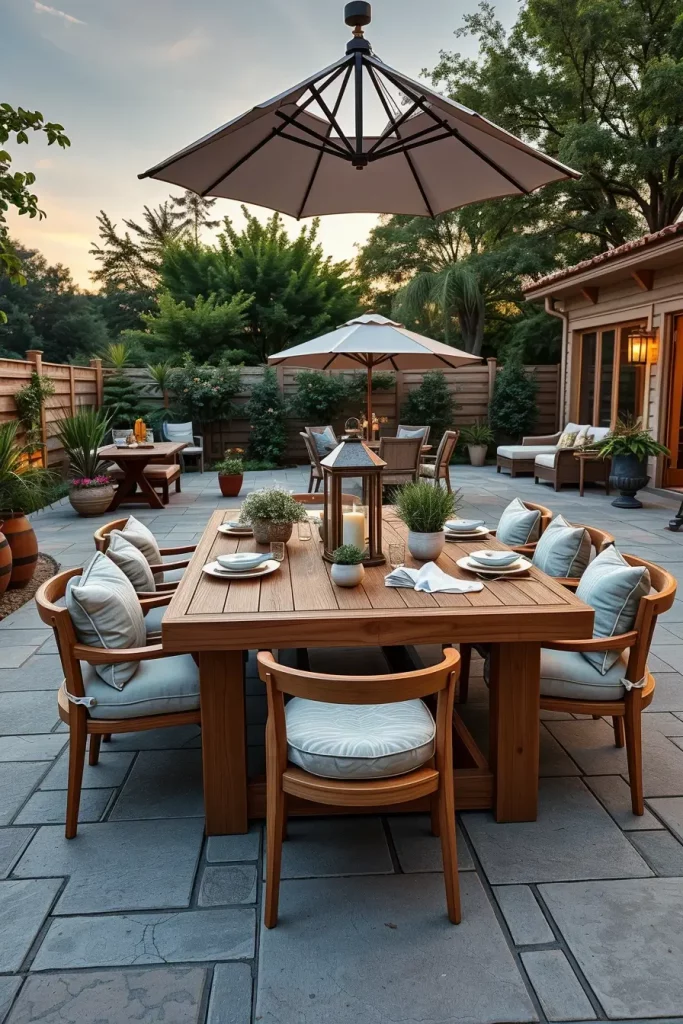 I usually start with a durable outdoor dining table made of teak, aluminum, or weather-resistant composite materials. Comfortable dining chairs with cushions make a big difference during longer meals. I often add a large umbrella or pergola above the table to provide shade and protect guests from strong summer sun.