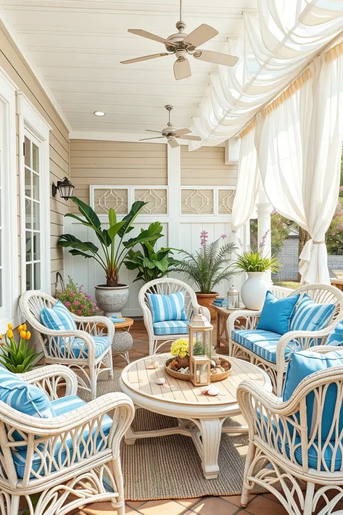 Bright Coastal-Inspired Patio Decor With Blue And White Accents
