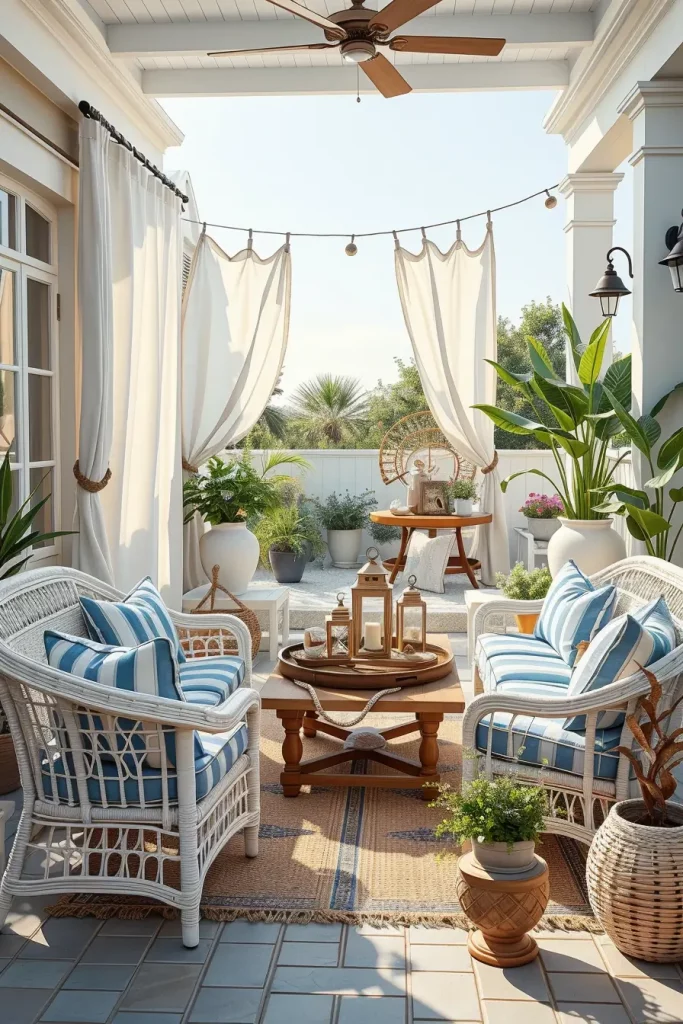 I typically combine white outdoor furniture with blue cushions, striped textiles, and light wood finishes. Wicker lounge chairs, rope accents, and driftwood-style tables work beautifully in this concept. Decorative accessories such as seashell bowls, coastal lanterns, and ceramic vases in ocean tones help reinforce the theme without making the space look overly themed.