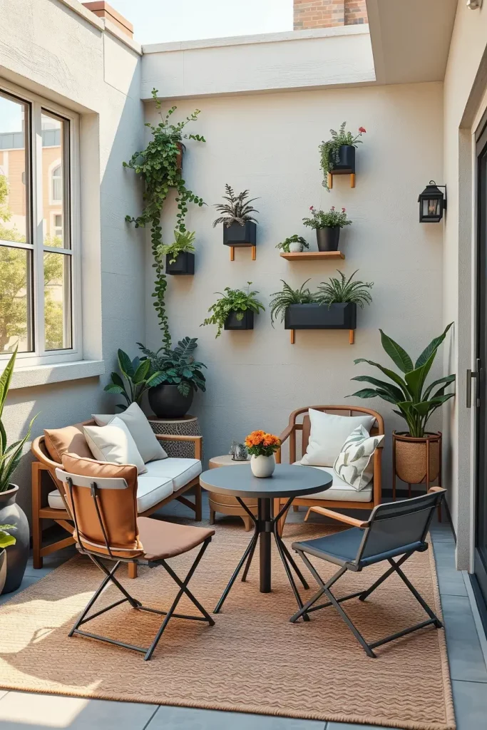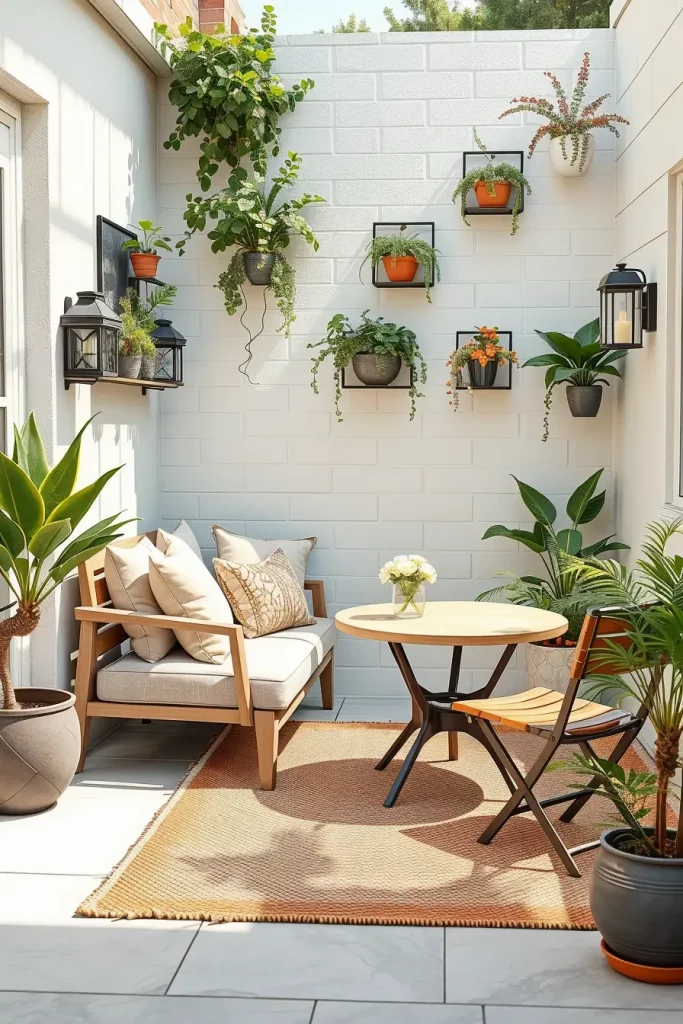 For furniture, I prefer compact pieces such as a small outdoor loveseat, foldable chairs, or slim-profile lounge seating. A round bistro table often works better than large rectangular tables because it takes up less visual and physical space. I also incorporate vertical decor such as wall-mounted planters, hanging greenery, or slim shelving units that add personality without crowding the patio.