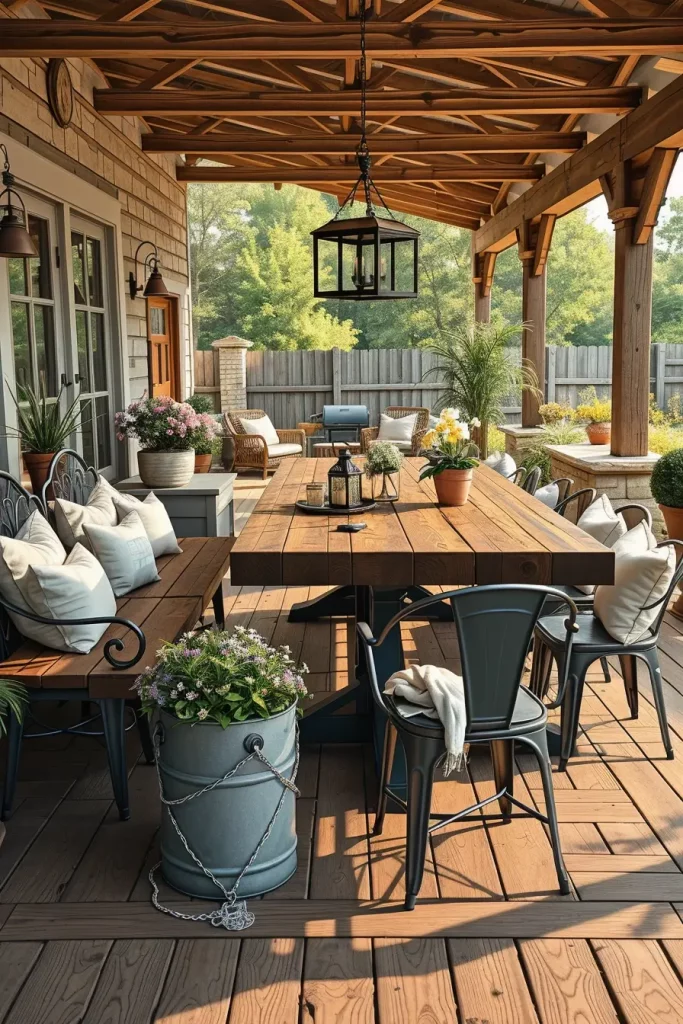 A large wooden dining table or farmhouse bench usually becomes the centerpiece of the patio. I pair these with metal-framed chairs, wooden stools, or woven seating to maintain a rustic yet balanced design. Decorative elements such as galvanized metal planters, vintage lanterns, and ceramic pitchers enhance the farmhouse aesthetic.