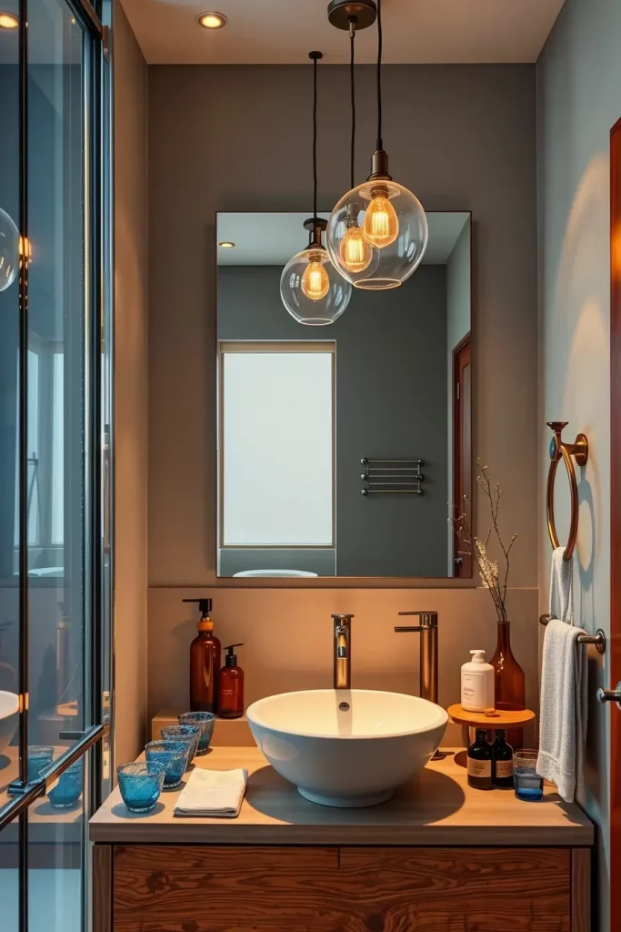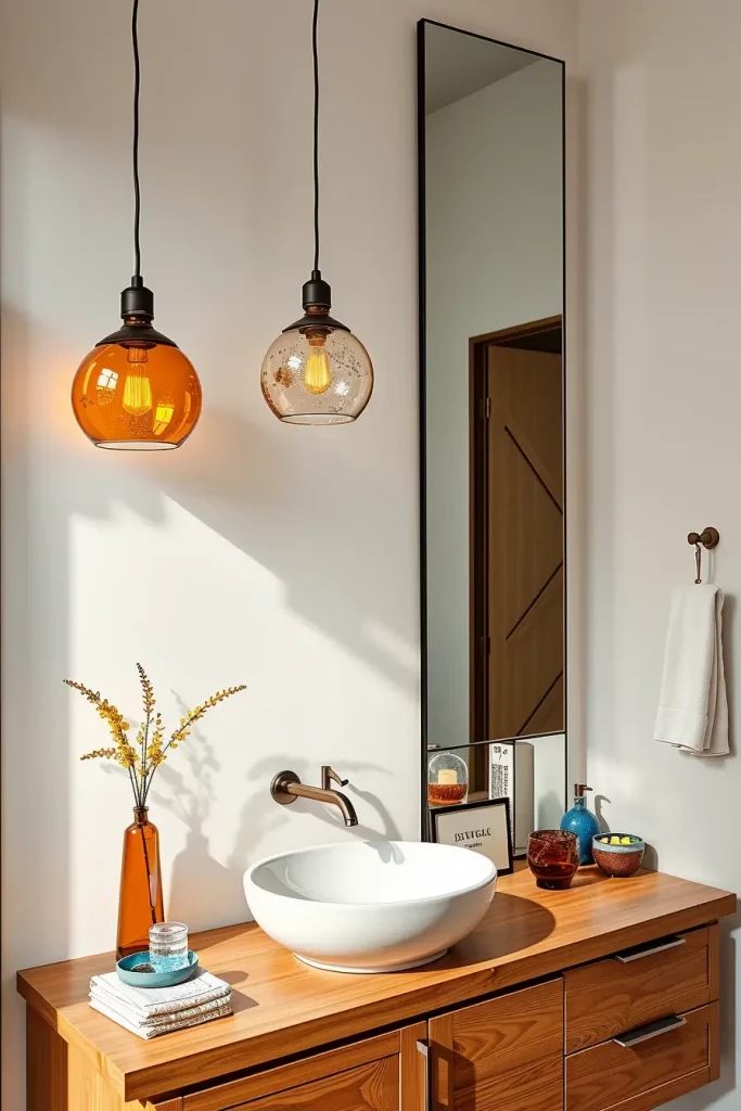 Using artisan glass pieces enhances the bathroom with both light and detail. Handblown glass elements—whether in the form of pendant lights, decorative vessels, or privacy screens—bring a softness and shimmer that manufactured pieces simply can’t match. I use trinkets to make my decor look nicer without making the space look cluttered.