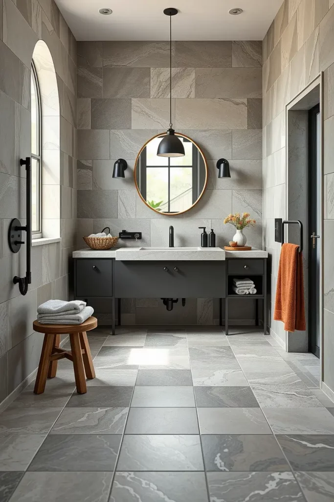 Stone vanities, slate flooring and marble shelves help make this idea even better. They provide durability and a visual grounding quality. No two slabs are alike, so each worktop looks original. Having both matte black and brushed brass taps with stone can result in a perfect mix of old and new styles.