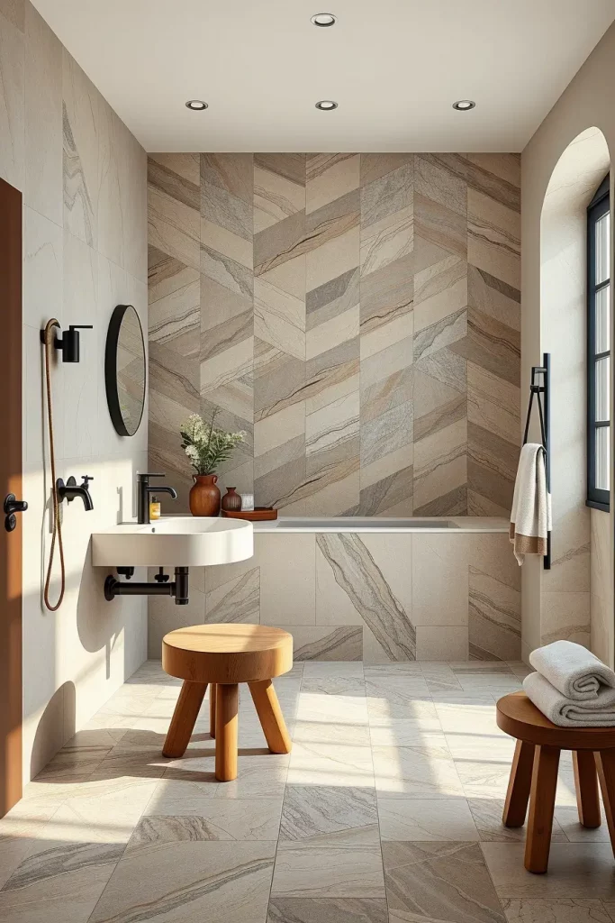Recently, I used a hand-painted tile mural behind the sink as a backsplash, so that it would really stand out. I mostly choose encaustic tiles that are calm and gentle in colors like charcoal, terracotta and soft blue. The different ways the bathroom is decorated make it feel both custom-made and engaging. When tiles are used in a limited way, they fit well with minimalist design, offering some extra style without making spaces too busy.