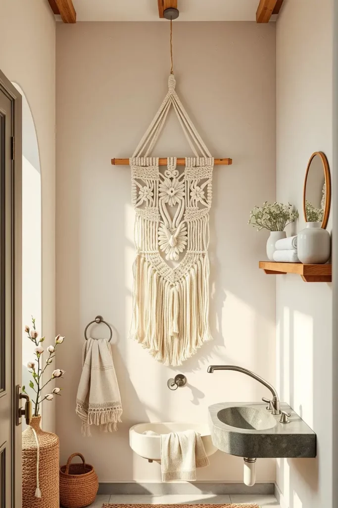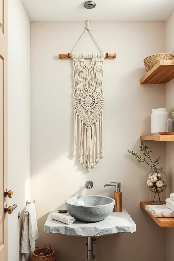 I sometimes put up a soft macrame piece above the toilet or in a confined wall space. Other natural textures such as linen and stone, fit well with natural cotton. To get a modern look, I choose clean and geometric-shaped macrame over the more bohemian and wavy designs.