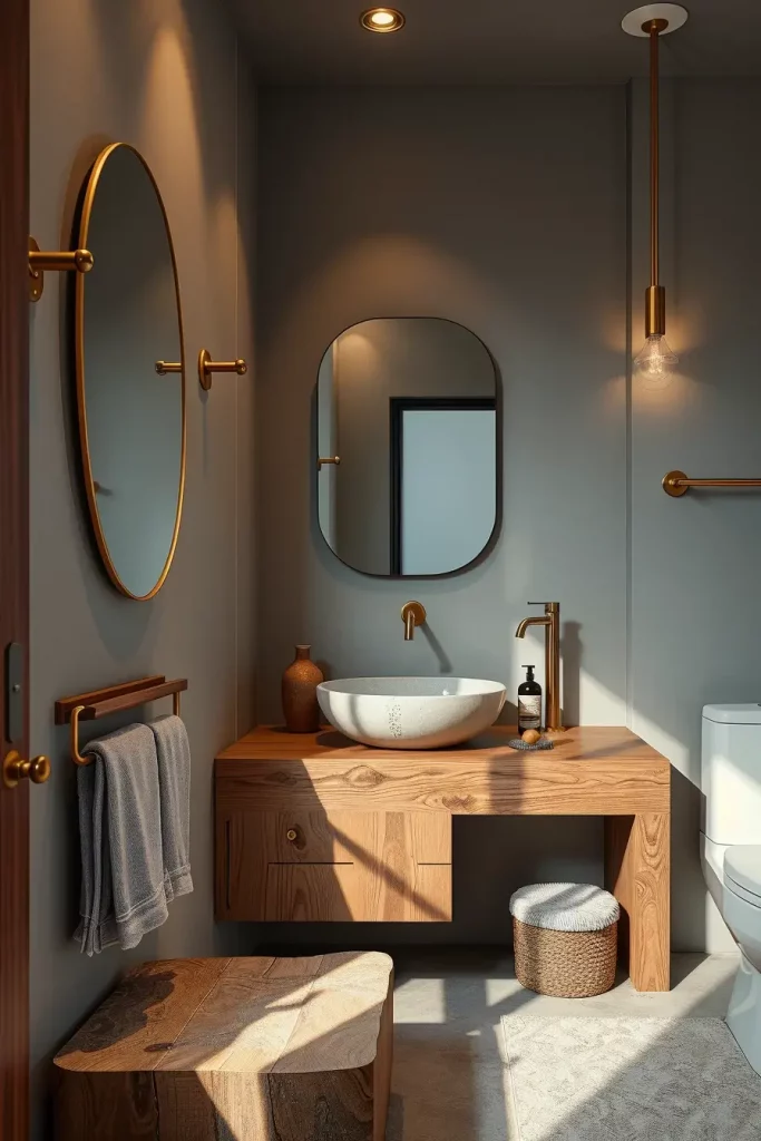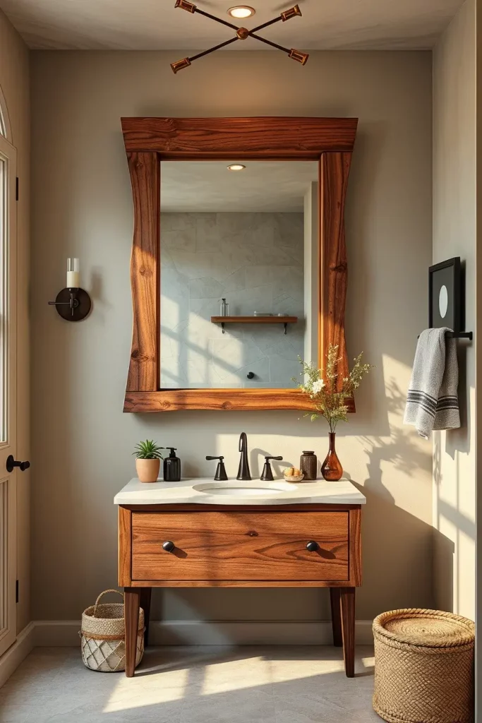 Usually, my interiors have teak stools, custom oak mirrors and ceramic lighting, finished in earth-like colors. They look good now and have stayed that way through the years. Choosing a reclaimed wood vanity will add both charm and strength and handwoven baskets can help keep your toiletries neat and orderly. When you choose sustainable decor, your room looks nice and you help the environment—a great thing for modern tastes.