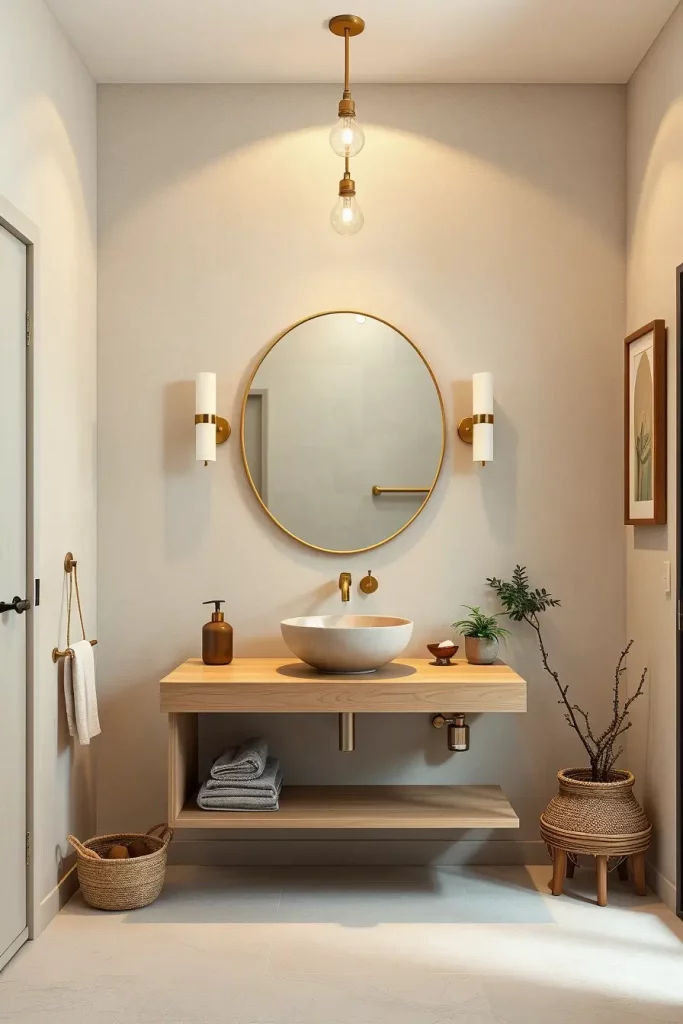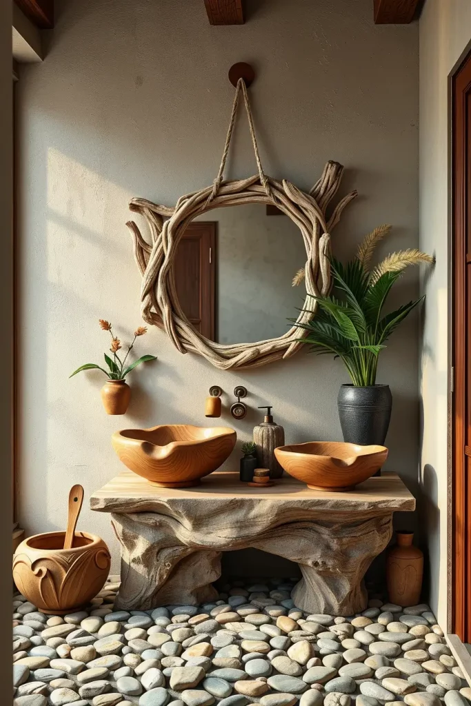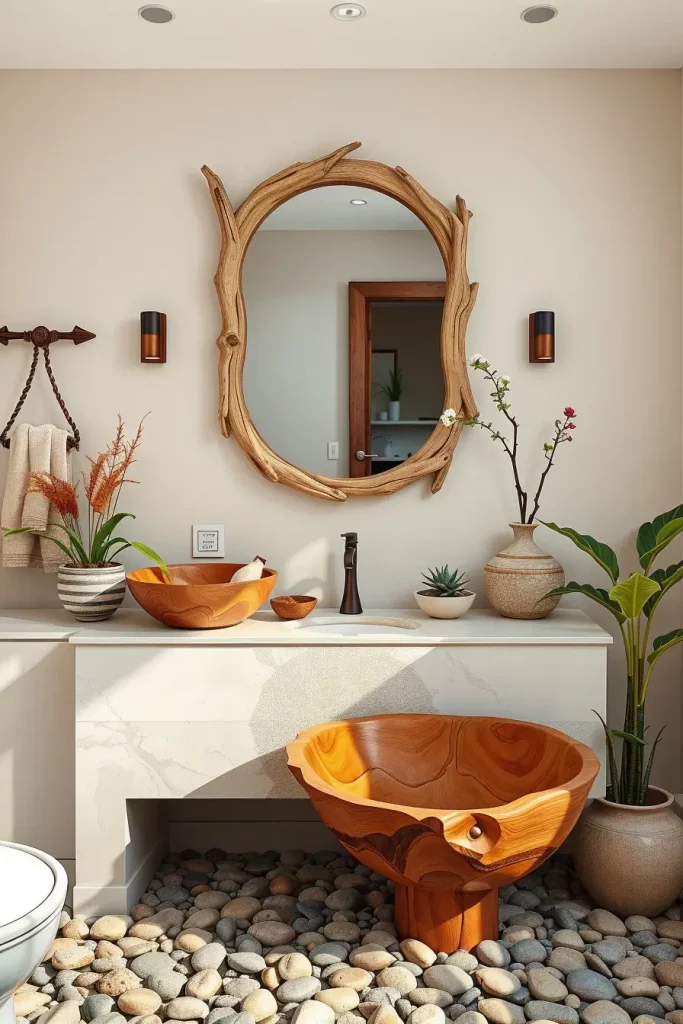 I combine decorations including hand-carved bowls in wood, driftwood framed mirrors, pottery planters and woven hanging lights. The items are created to look like waves, leaves and stones, giving tranquil visual interest. Having raw wood, matte ceramics and woven materials add a soft touch to harder bathroom surfaces.