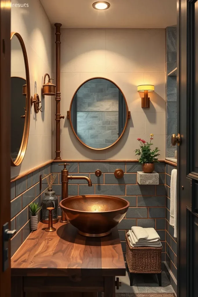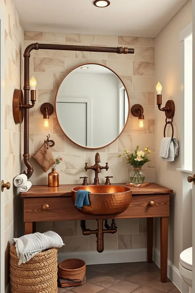 I really enjoy having a copper faucet with pipes on show, installed with a rustic concrete or marble sink. Their appearance improves with age and they grow a lovely patina. It is also possible to purchase hammered copper mirrors or sconces that have a subtle shine but keep the traditional style.