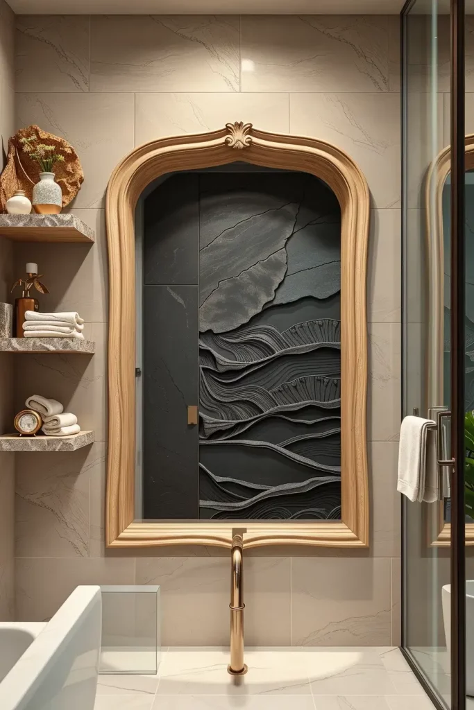 You can use stone carvings to bring in stylish bathroom art for practical use. Carved soap holders, integrated shelves and sculpted mirrors provide the space character and soul. They fit well with bathrooms that have wood or linen already.
