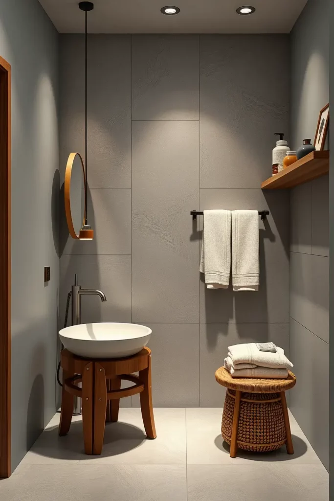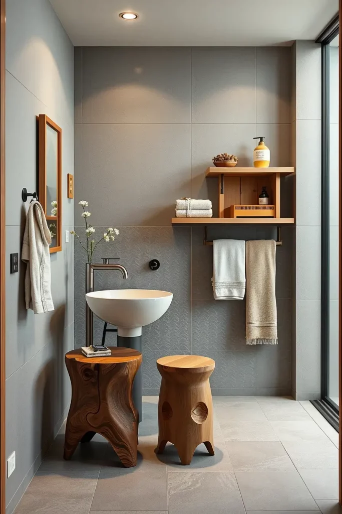 What I prefer are small wooden stools made by hand, basins with wheel marks and ash or walnut wooden shelving. It is typical for these types of spaces to only use soft neutrals, stone greys and light woods for color and the workmanship is apparent in all the fine points. An item should work well and also have a pleasant design.