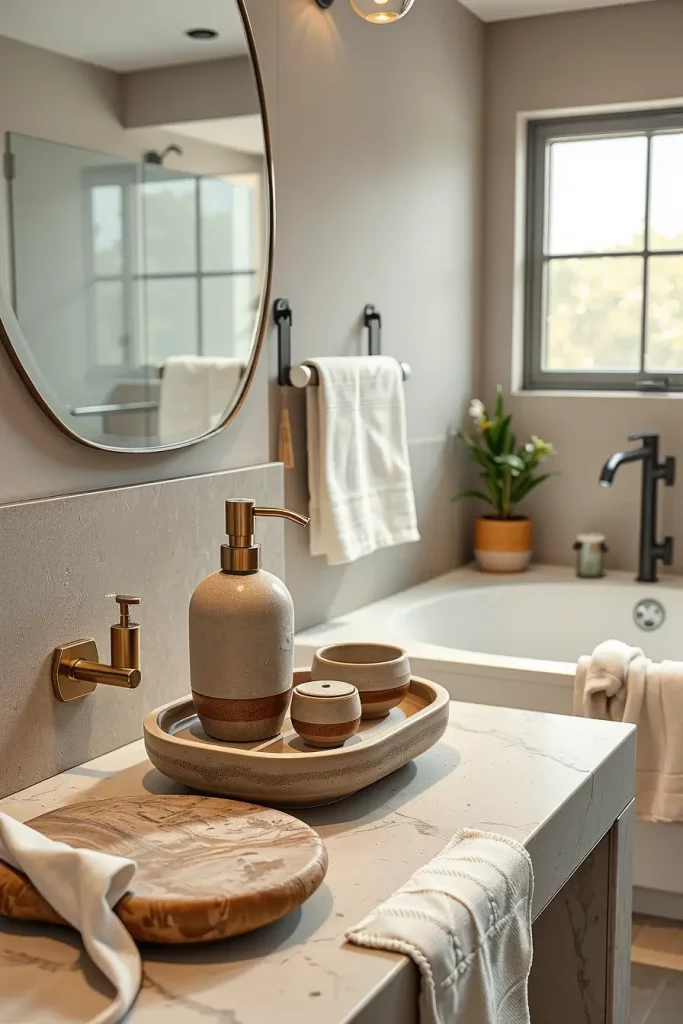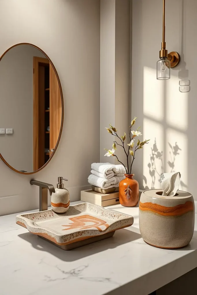 For an artisanal bathroom to look great, I often advise getting sets made by hand which can include everything like soap dispensers, trays, toothbrush holders and containers that combine well. Such matching pieces blend the space and bring a polished form of consistency to the interior. I appreciate artists in ceramic who can use earthen hues for their glazes to fit with the whole theme.