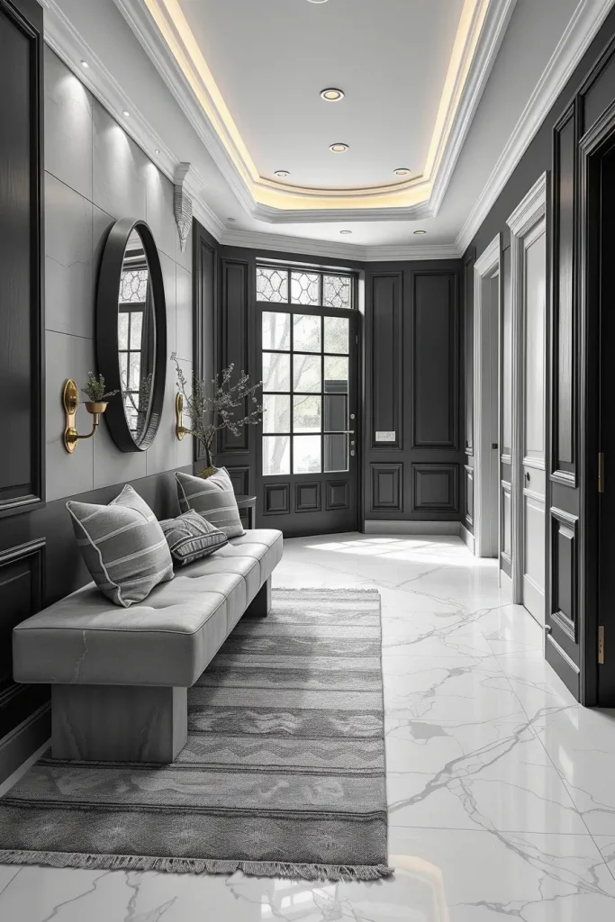Color often helps make a space cheerful, but I think an entry done in just black and white can also stand out. Having a room decorated in a single color doesn’t have to be bland if you vary the surfaces you use. It appears stylish, rather elegant and carefully organized.