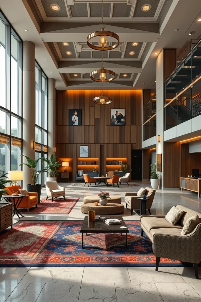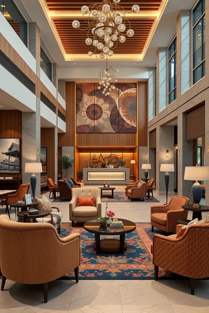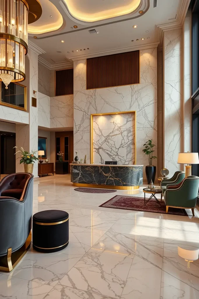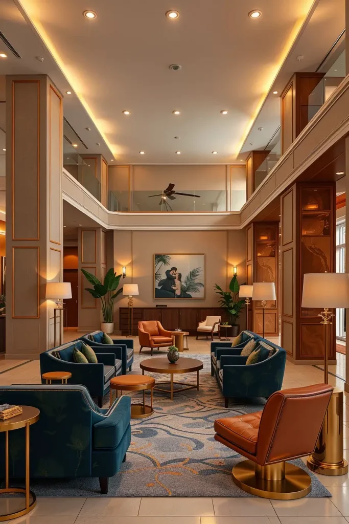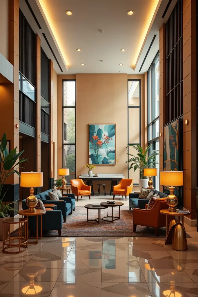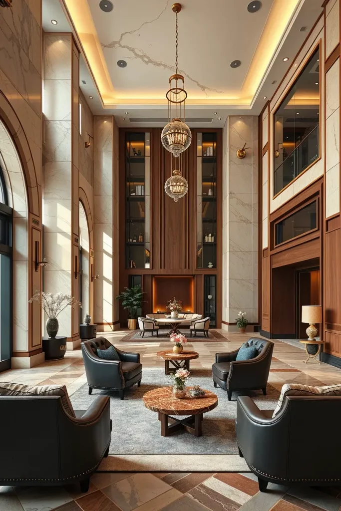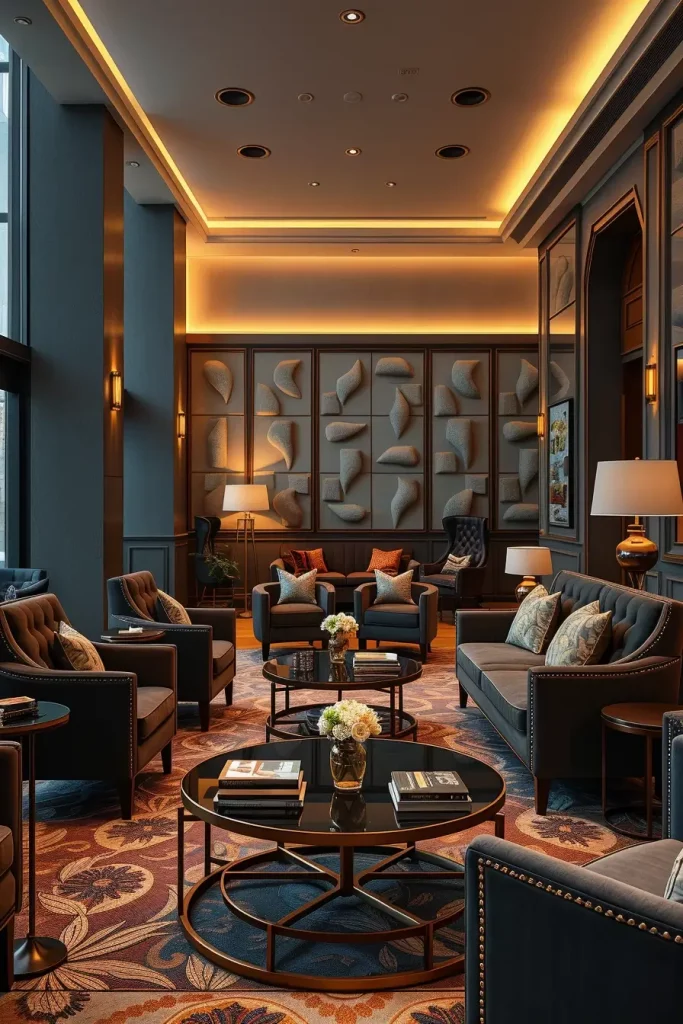 I love using Art Deco style for my inspiration in designing lobbies. Heavy curtains, lines drawn from geometry and elegant gold or silver accents are major parts of this decor which suits historic buildings or high-end hotels well. Applying Art Deco ideas to lobby design makes it seem elegant and glamorous.