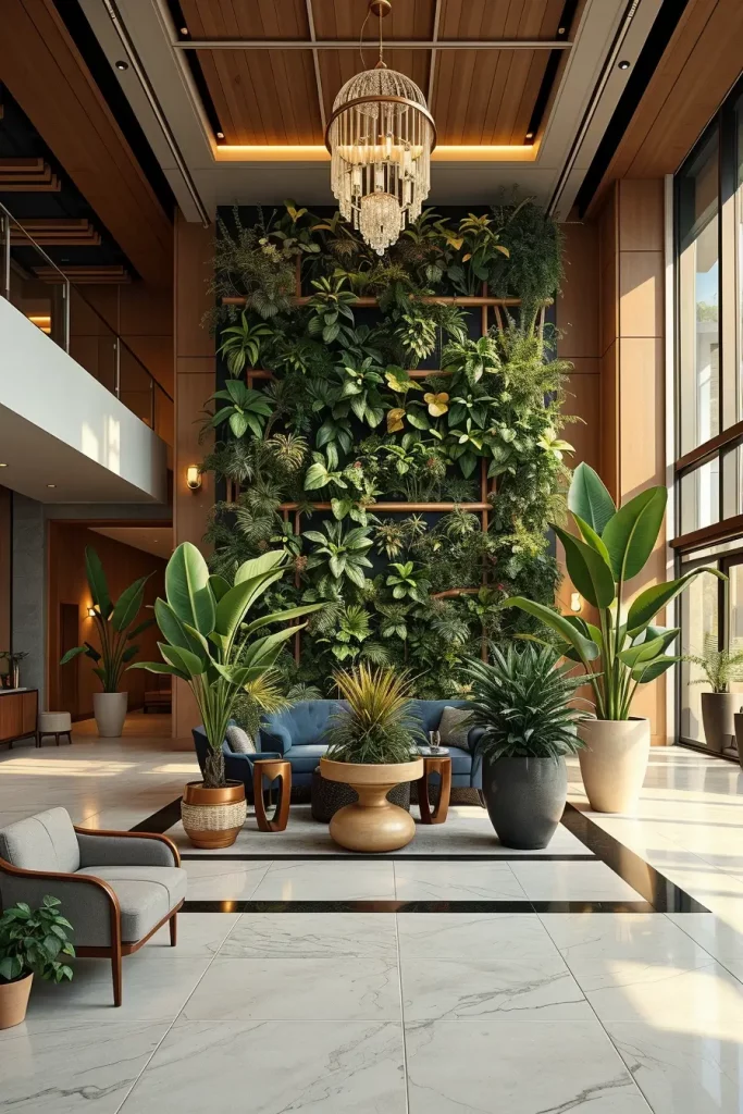 For most spaces, I use large potted plants such as fiddle-leaf figs, indoor palms or a garden wall. Planters can be part of a seating area or put along certain structural lines. They improve the lobby decor by attracting attention and keeping guests present.