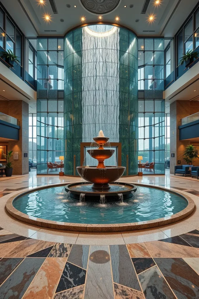 Using a water feature is a great way to make a lobby a quiet and peaceful place to wait. Hearing running water brings a sense of calm into your space and also helps block out background noise. A water feature makes a powerful centerpiece by presenting motion and light that can draw attention easily.