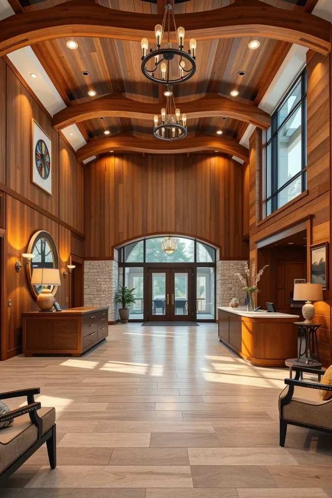 Interior wood finishes are among the best ways to add a cozy feeling to a lobby space. If a building is mainly made of stone and glass, wood adds a sense of balance by adding texture, tone and an interesting touch. It guides how the space is arranged and makes sure guests enjoy an inviting ambiance from the beginning.